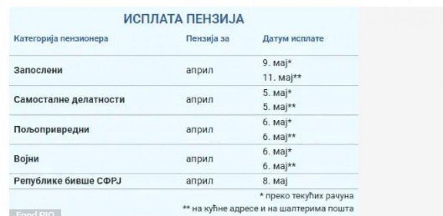 Prvi će svoje penzije dobiti penzioneri iz kategorije samostalnih delatnosti, i to 5. maja, zatim poljoprivredni i vojni penzioneri - 6. maja, a, na kraju, i penzioneri iz kategorije zaposlenih. Oni će svoj novac dobiti 9, odnosno 11. maja.