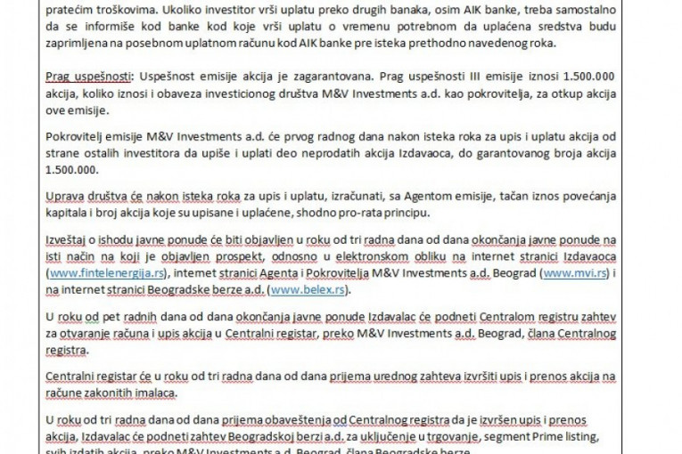 Rok za upis i uplatu akcija kompanije Fintel Energija a.d je od 01.08.2018. do 29.10.2018, a upis akcija vrši se u investicionom društvu M&V Investments a.d., Beograd, Bulevar Mihaila Pupina 115e.