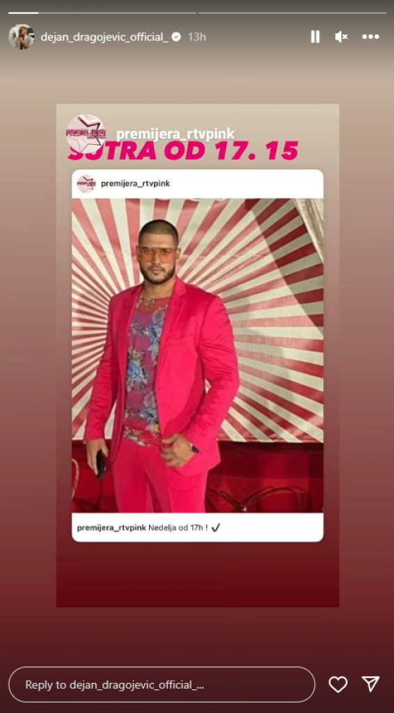 Naime, Dejan je putem svog profila na Instagramu najavio da će danas biti gost televizije Pink, tačnije da će imati uživo uključenje u emisiji "Premijera - Vikend Specijal". Dragojević će sigurno pored dešavanja iz svog privatnog života govoriti i o aktuelnim temama iz rijalitija "Elita", koje već danima unazad tresu javnost.