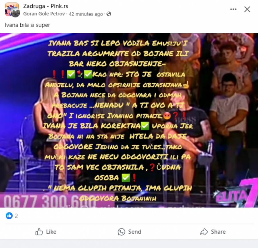 - Ivana, baš si lepo vodila emisiju i tražila argumente od Bojane ili bar neko objašnjenje. Kao na primer, zašto je ostavila Anđelu?! Da malo opširnije objašnjava, a Bojana neće da odgovara i odmah prebacuje Nenadu: "a ti ovo, a ti ono". Ivana je bila korektna i uporna jer Bojana ni na šta nije htela da daje odgovore, jedino da je tučeš... tako mučki kaže: "ne, neću odgovoriti", ili: "pa to sam već objasnila", čudna osoba... nema glupih pitanja, ima odgovora - stajalo je u opisu jedne stranice na društvenoj mreži Fejsbuk.