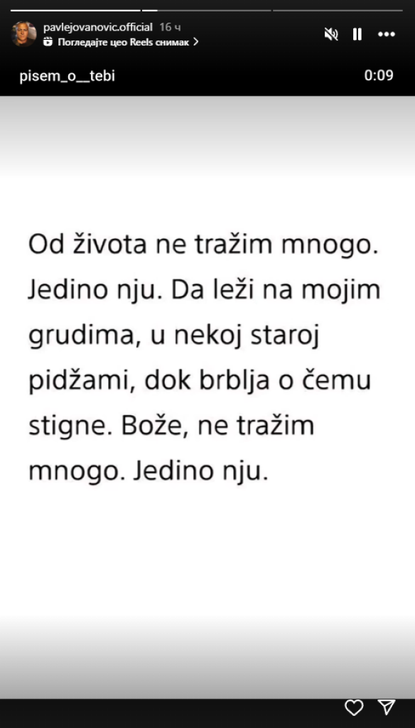 - Od života ne tražim mnogo. Jedinu nju. Da leži na mojim grudima, u nekoj staroj pidžami, dok brblja o čemu stigne. Bože, ne tražim mnogo. Jedino nju - pisalo je na fotografiji koju je Pavle objavio.