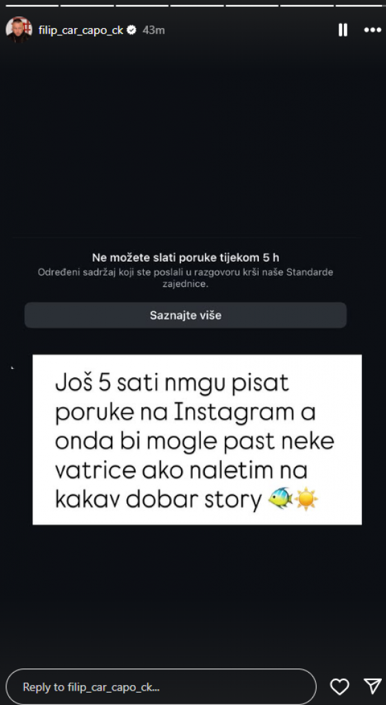 - Još pet sati ne mogu pisati poruke na Instagramu, a onda bi mogle pasti neke vatrice ako naletim na kakav dobar stori - napisao je Filip Car.