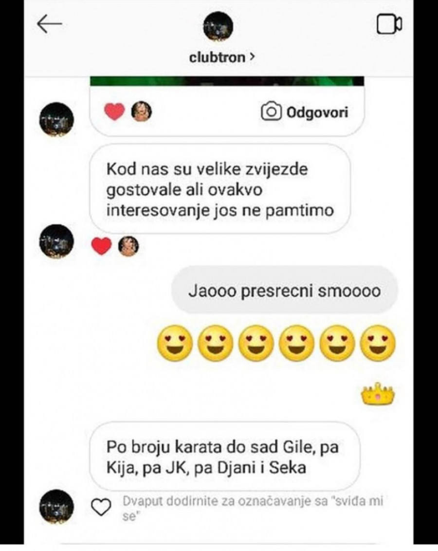 Naime, jedan od vlasnika tog lokala na Instagramu joj je poslao poruku da je njen nastup najposećeniji u proteklih nekoliko meseci, te da ona zauzima prvo mesto. Kako stoji u poruci, vlasnik bosanskog kluba napisao je da ne pamti tako veliko interesovanje, a da je po broju karata pre nje bio Amar Gile Jašarspahić, zatim Jelena Karleuša, Radiša Trajković Đani i Seka Aleksić.
