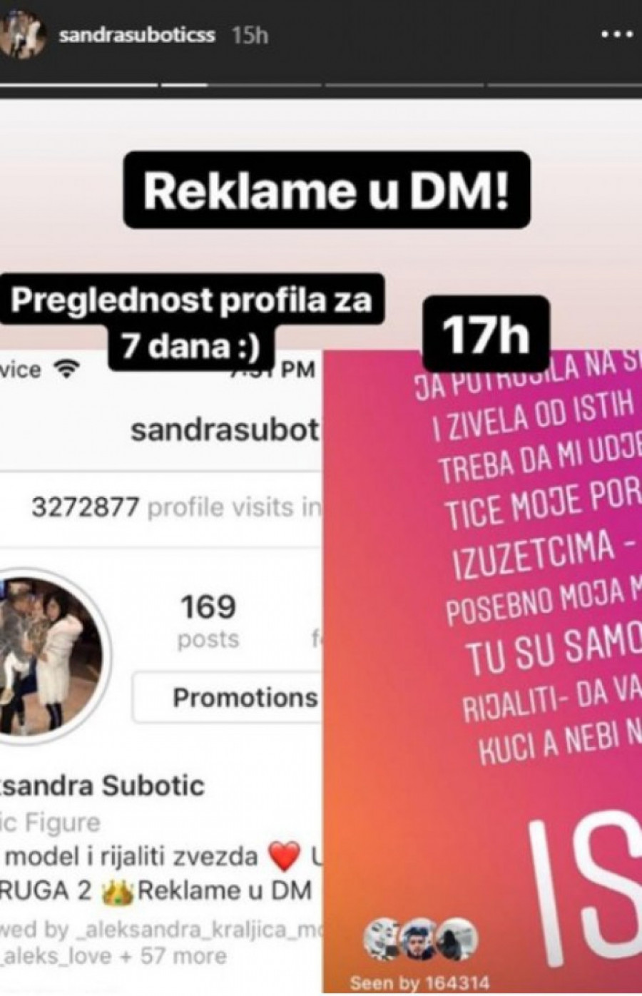 Foto: instagram.com/sandrasuboticssNakon toga, Subotićka je napisala i da, ko želi, može da joj se javi putem poruka za reklame, a po svemu sudeći, odlično joj ide.