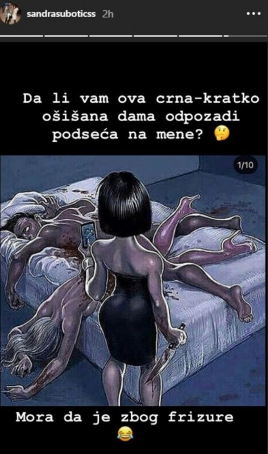 Naime, Aleksandra je objavila crtež na kome je prikazano dvoje ljubavnika koji leže iskasapljeni u krevetu, a iznad njih sa nožem stoji devojka s frizurom identičnom Aleksandrinoj i sve to snima telefonom.