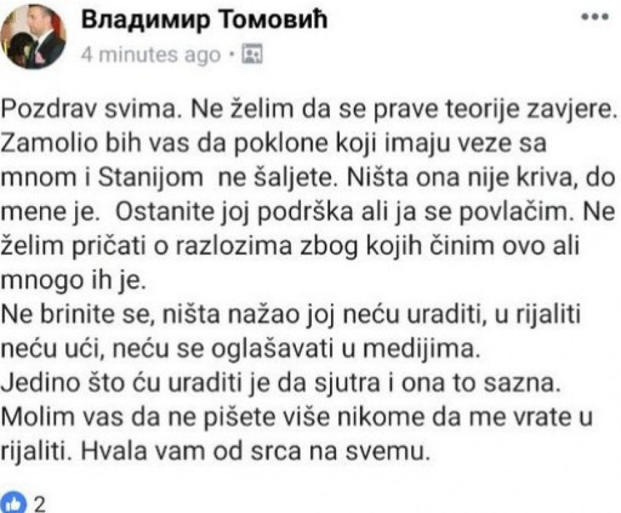 Vladaimir Tomović obavestio je javnost da je za njega veza sa starletom Stanijom Dobrojević, koja se nalazi u "Zadruzi", gotova. Međutim, malo po objavljivanju svojih misli, bivši takmičar rijalitija se predomislio, pa napisano obrisao.