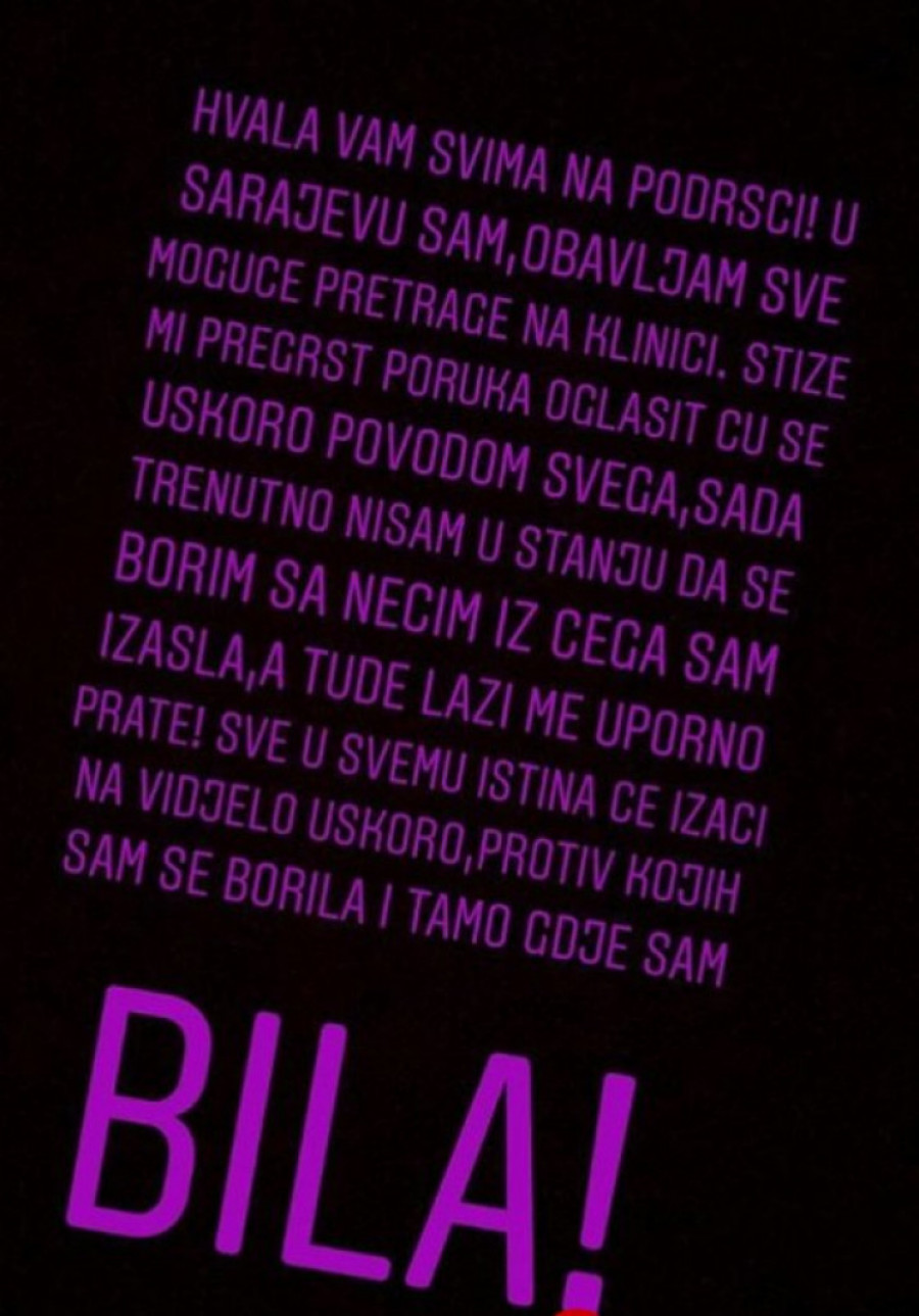Foto: instagram.com/zerinooooo_13- Hvala vam svima na podršci, u Sarajevu sam, obavljam sve moguće pretrage na klinici - napisal je između ostalog Zerina Hećo.