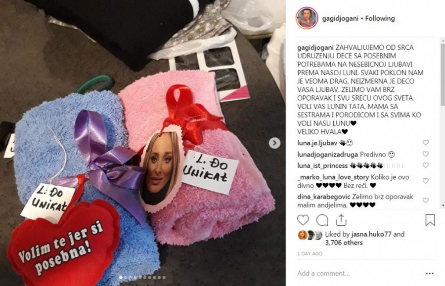 - Zahvaljujemo od srca Udruženju dece sa posebnim potrebama na nesebičnoj ljubavi prema našoj Luni. Svaki poklon nam je veoma drag, neizmerna je, deco, vaša ljubav. Želimo vam brz oporavak i svu sreću ovog sveta. Voli vas Lunini tata, mama sa sestrama i porodicom i sa svima ko voli našu Lunu? Veliko hvala - napisao je Gagi pored nekoliko fotografija na kojima su bili peškiri, nakit, plišane igračke i razne sitnice sa Luninim likom.