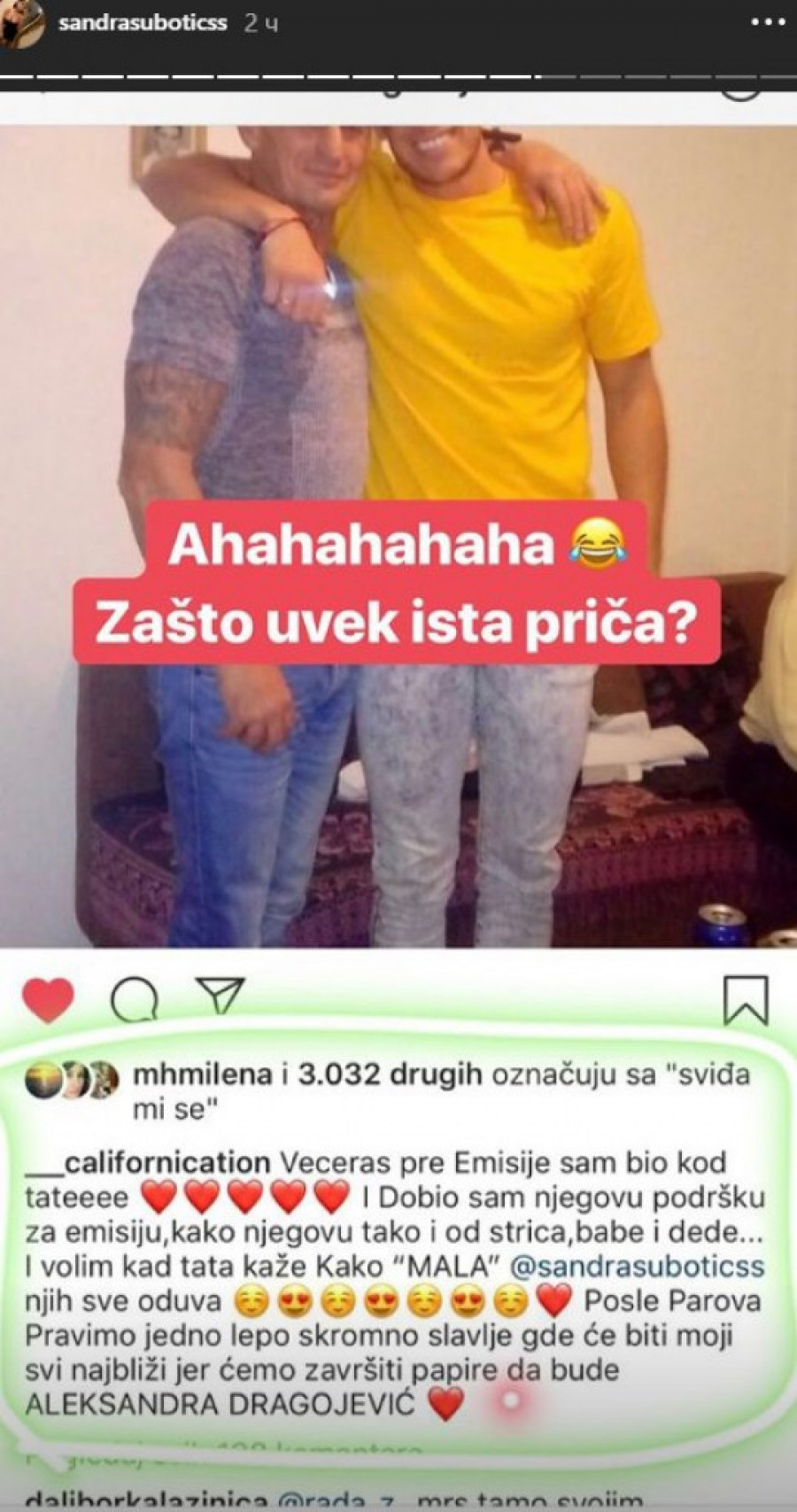 Foto: instagram.com/sandrasuboticssIzgleda da Dragojević prilikom svakog emotivnog odnosa ima "foru" koju prodaje svojim devojkama, a to je isto pričao i Aleksandri nakon što su uplovili u emotivnu vezu.