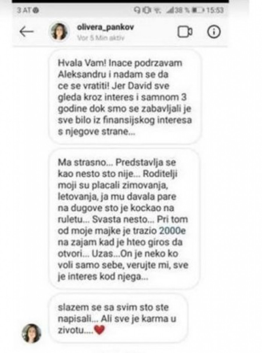 - Inače podržavam Aleksandru i nadam se da će se vratiti! Jer David sve gleda kroz interes i sa mnom tri godine dok smo se zabljavali je sve bilo iz finansijskog interesa s njegove stranu - stoji u prepisci.