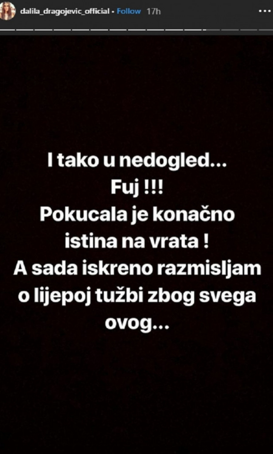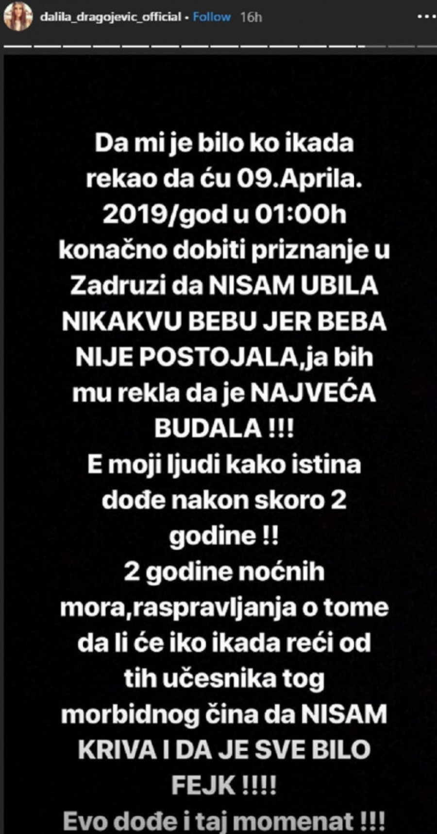 Foto: instagram.com/dalila_dragojevic_official- Pokucala je konačno istina na vrata. A sad iskreno razišljam o lepoj tužbi zbog svega ovoga. Da mi je bilo ko ikada rekao da ću 9. aprila 2019. u jedan sat posle ponoći konačno dobiti priznanje u "Zadruzi" da nisam ubila nikakvu bebu, jer beba nije ni postojala, ja bih mu rekla da je najveća budala - započela je Dalila i nastavila: