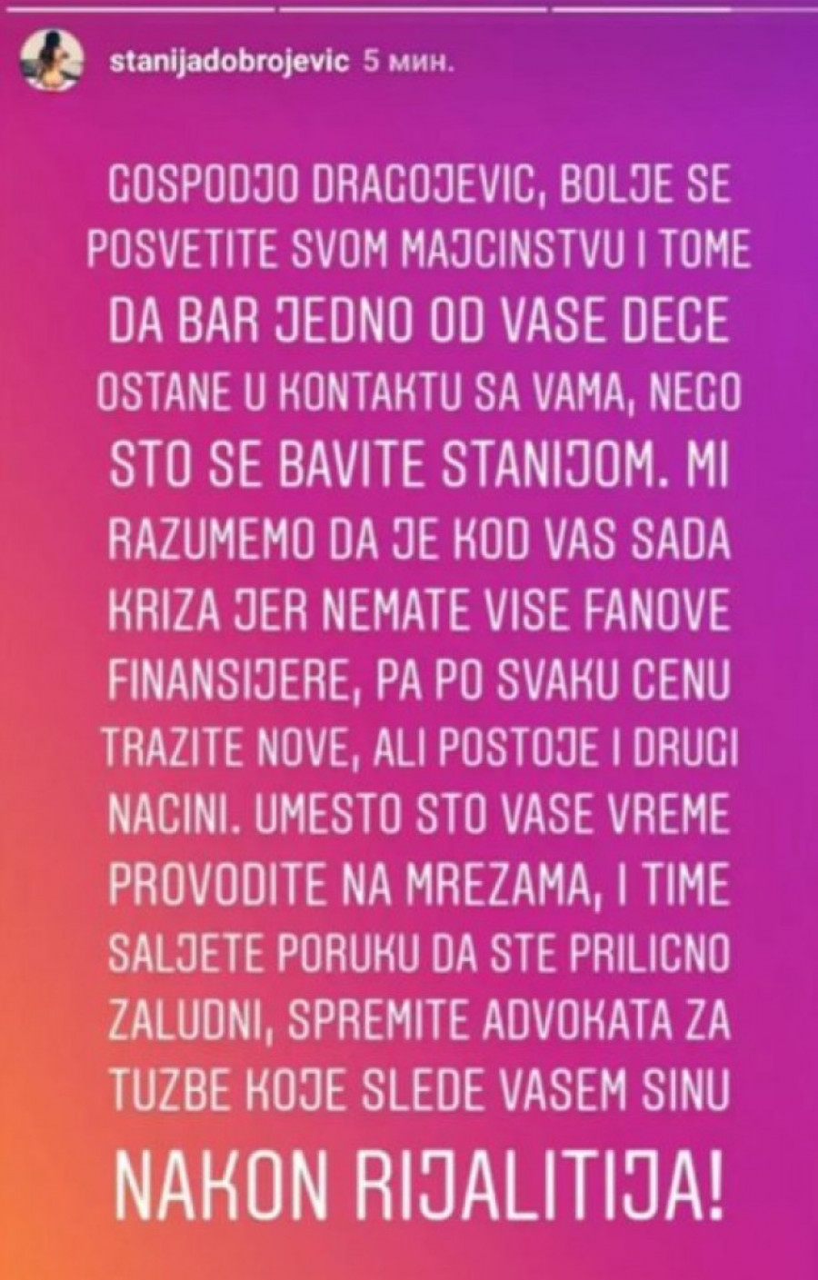 - Gospođo Dragojević, bolje se posvetite svom majčinstvu i tome da bar jedno od vaše dece ostane u kontaktu sa vama, nego što se bavite Stanijom. Mi razumemo da je kod vas sada kriza jer nemate više fanove finansijere, pa po svaku cenu tražite nove, ali postoje i drugi načini. Umesto što vaše vreme provodite na mrežama, i time šaljete poruku da ste prilično zaludni, spremite advokata za tužbe koje slede vašem sinu nakon rijalitija - glasila je poruka Stanijinog PR tima.