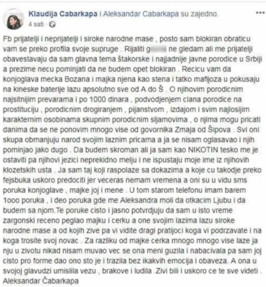 - Fb prijatelji i neprijatelji i široke narodne mase, pošto sam blokiran obratiću vam se preko svoje supruge. Rijaliti go*na ne gledam, ali me prijatelji obaveštavaju da sam glavna tema štakorske i najjadnije javne porodice u Srbiji, a prezime neću pominjati da ne budem opet blokiran. Reći ću vam da konjoglava mečka Božana i majka njena kao stena i tatko mafijoza u pokušaju na kineske baterije, lažu apsolutno sve od A do Š. O njihovim porodičnim najsitnijim prevarama i po 1000 dinara, podvođenjem člana porodice na prostituciju, porodičnim drogiranjem, pijanstvom, izdajom i svim najlošijim karakternim osobinama skupnim porodičnim šljamovima, o njima mogu pričati danima da se ne ponovim mnogo više od govornika Zmja od Šipova. Svi oni skupa obmanjuju narod svojim lažnim pričama, a ja se nisam oglašavao i pominjao njih jako dugo - piše između ostalog u Čabarkapinom obaveštenju javnosti.