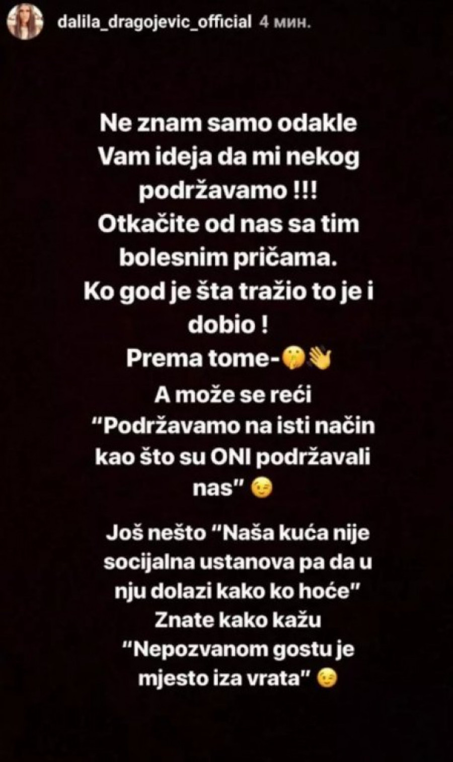 - Ne znam samo odakle vam ideja da mi nekog podržavamo?! Otkačite od nas sa tim bolesnim pričama. Ko god je šta tražio, to je i dobio! Može se reći da ”podržavamo na isti način kao što su oni podržali nas. Još nešto. Naša kuća nije socijalna ustanova, pa da u nju dolazi kako ko hoće. Znate kako kažu: ”Nepozvanom gostu je mesto iza vrata - stoji na Dalilinom storiju na društvenoj mreži Instagram.