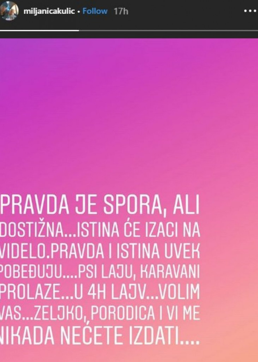 - Pravda je spora, ali dostižna. Istina će izaći na videlo. Pravda i istina uvek pobeđuju. Psi laju, karavani prolaze. U četiri sata lajv. Volim vas! Željko, porodica i vi me nikada nećete izdati - napisala je Miljana posle gostovanja Zolinog menadžera koji ju je žestoko kritikovao i reči voditelja koji je otkrio da mu je slala preteće poruke koje nisu za javno iznošenje.