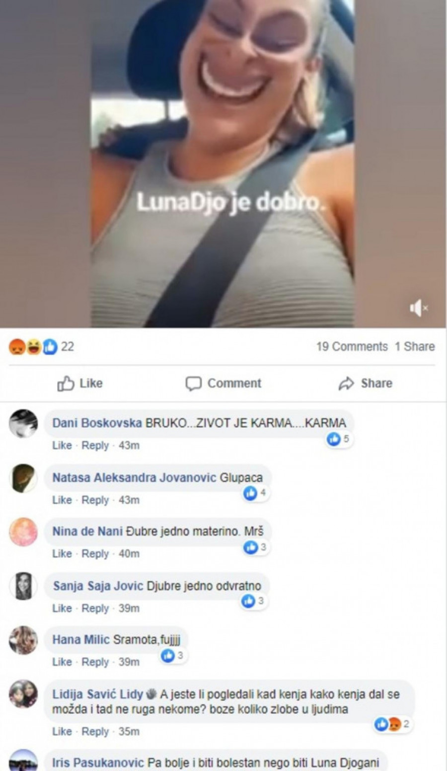 Foto: Printscreen/facebook"Pa bolje i biti bolestan nego biti Luna Đogani", "Đubre jedno odvratno", "Sramota, fuj", samo su neki od komentara na ovaj Lunin klip.