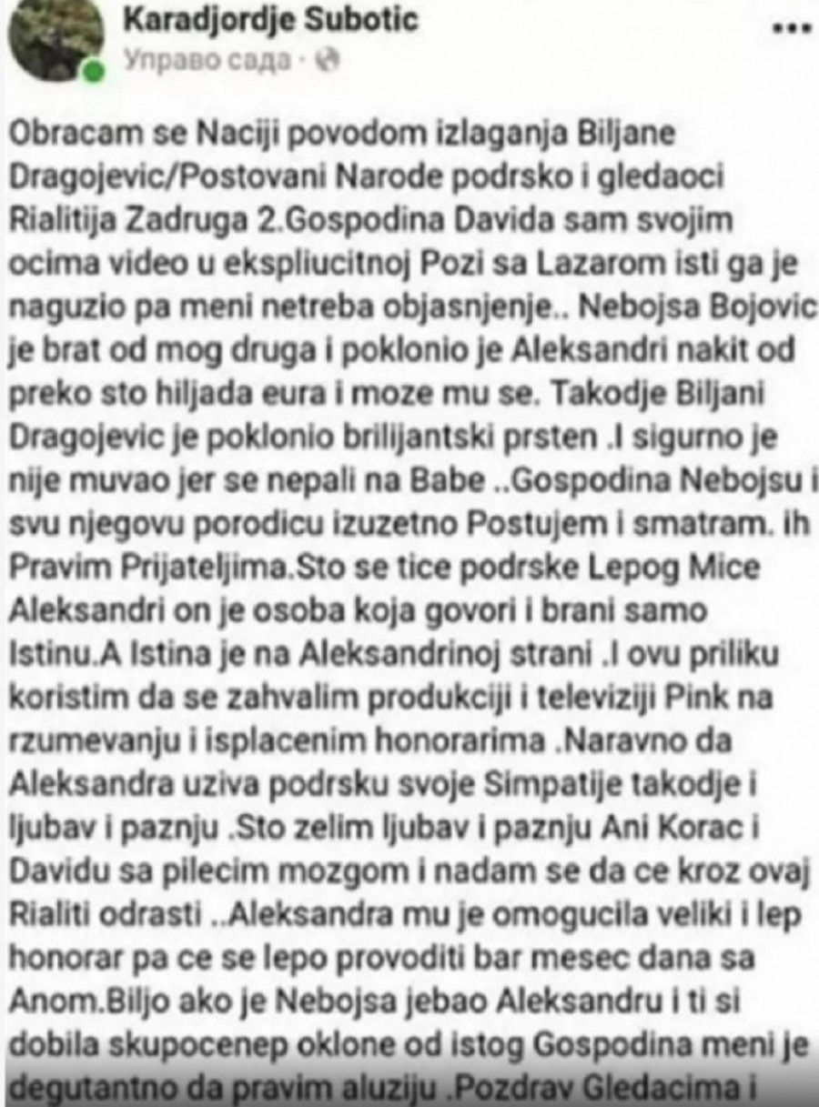 - Obraćam se naciji povodom izlaganja Biljane Dragojević. Poštovani narode, podrško i gledaoci rijalitija "Zadruga 2". Gospodina Davida sam svojim očima video u eksplicitnoj pozi sa Lazarom. Isti ga je nag*zio, pa meni ne treba objašnjenje. Nebojša Bojović je brat od mog druga i poklonio je Aleksandri nakit od preko 100.000 evra i može mu se. Takođe, Biljani Dragojević je poklonio brilijantski prsten. I sigurno je nije muvao, ne pali se na babe. Gospodina Nebojšu i njegovu porodicu izuzetno poštujem i smatram ih pravim prijateljima. Što se tiče podrške Lepog Miće Aleksandri, on je osoba koja govori i brani samo istinu. A istina je na Aleksandrinoj strani. I ovu priliku koristim da se zahvalim produkciji i televiziji Pink na razumevanju. Naravno da Aleksandra uživa podršku svoje simpatije, takođe i ljubav i pažnju. Što želim i Ani Korać i Davidu sa pilećim mozgom, nadam se da će kroz ovaj rijaliti odrasti. Aleksandra mu je omogućila veliki i lep honorar, pa će se lepo provoditi bar mesec dana sa Anom. Biljo, ako je Nebojša j*bao Aleksandru, i ti si dobila skupocene poklone od istog gospodina. Meni je degutantno da pravim aluziju. Pozdrav gledaocima i svoj mojoj podršci. Glasajmo još jače za Aleksandru Subotić. Za razliku od Ane Korać, ona ima ozbiljnog muškarca i pravu ljubav pored sebe. Petre, ti si legenda - naveo je Karađorđe.