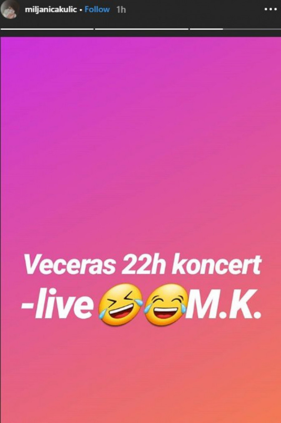 - Večeras od 22 sata koncert - lajv Miljana Kulić - napisala je Nišlijka na Instagram storiju gde će i biti emitovan lajv.