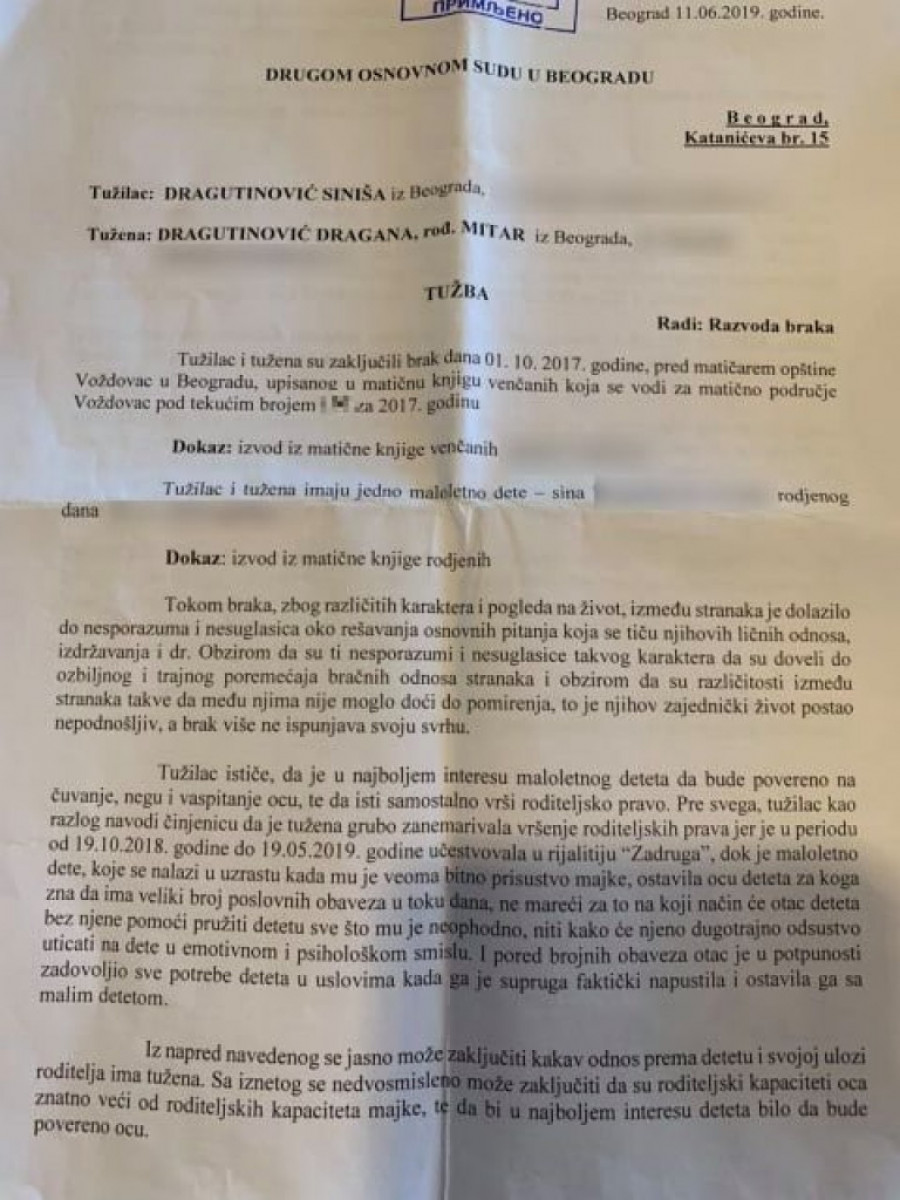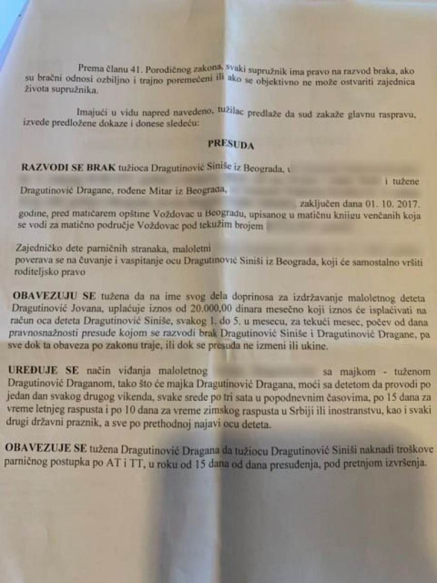 Kako Srpski telegraf saznaje, Siniša je podneo je tužbu protiv Dragane, gde od nje traži da sud donese odluku o oduzimanju maloletnog deteta tuženoj Dragani i da ona mesečno njemu plaća alimentaciju u iznosu od 20.000 dinara, kao i da mu nadoknadi troškove tužbe. Nakon ovih saznanja Dragana je protiv bivšeg muža podnela protivtužbu.