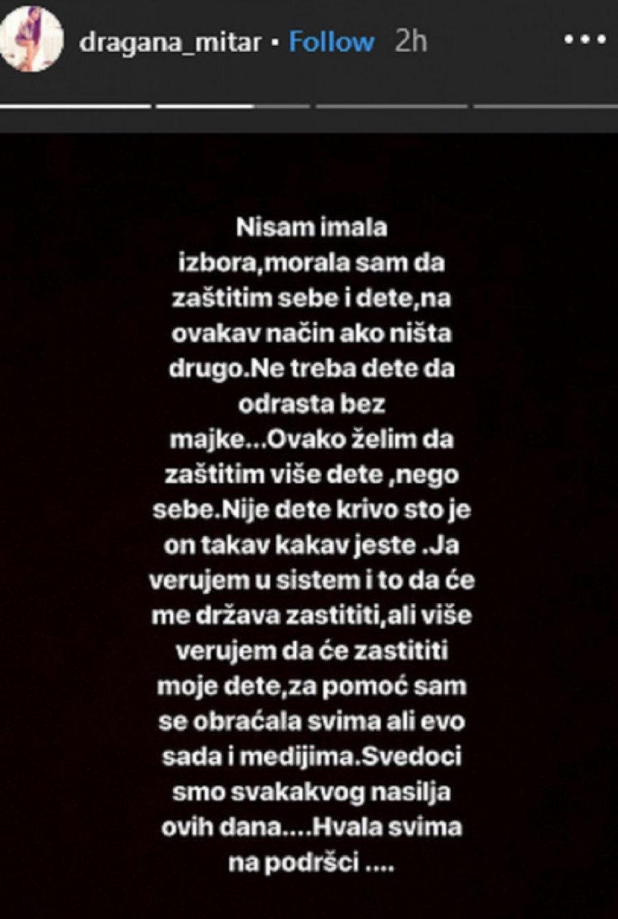 Čitajuće potresnu poruku, moglo bi se zaljučiti da je Dragana veoma uplašena za svoj život, ali joj je pre svega stalo da se zaštiti njen sin.