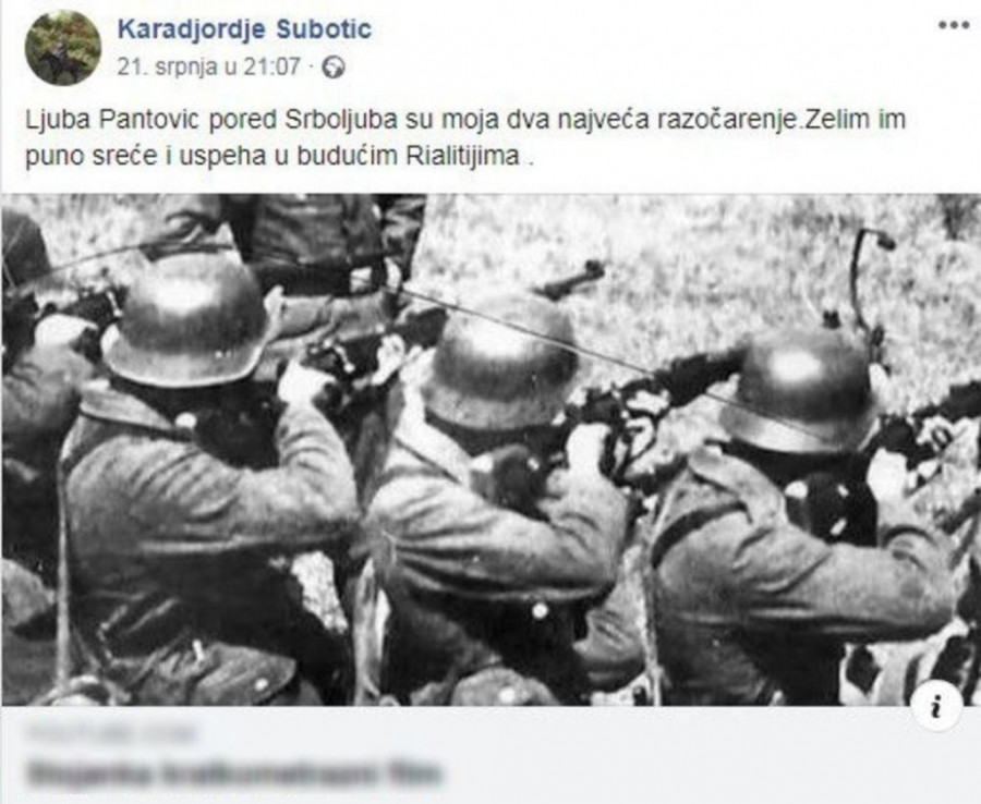 - Ljuba Pantović, pored Srboljuba, (to) su moja dva najveća razočaranja. Želim im puno sreće i uspeha u budućim rijalitijima - potpisao je Karađorđe šokantnu objavu na svom Fejsbuku, a onda istu i uklonio malo kasnije.