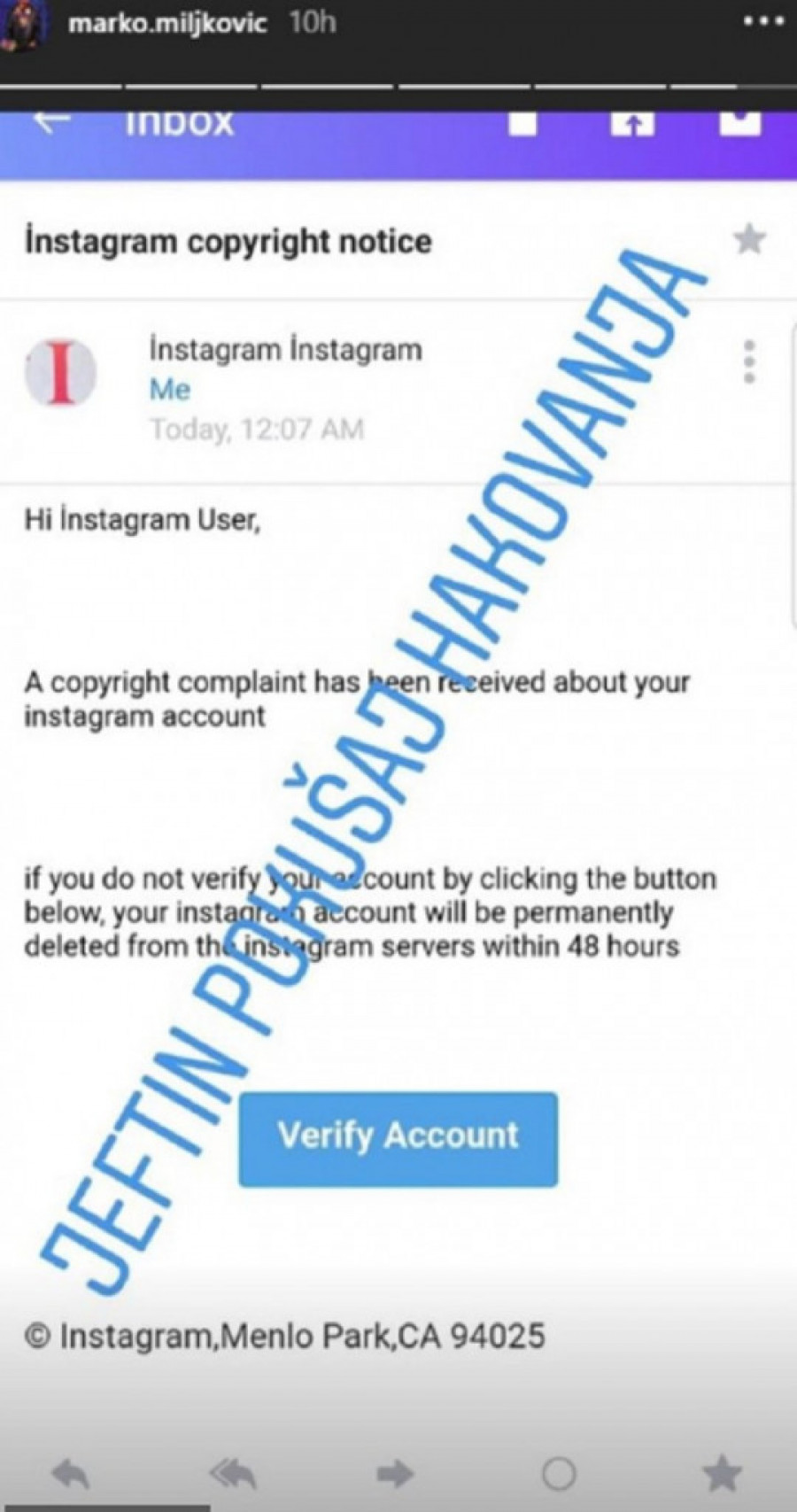 Naime, zadrugar objavio je poruku koja je stigla na adresu njegove društvene mreže, pa u opisu teksta napisao, "Jeftin pokušaj hakovanja".