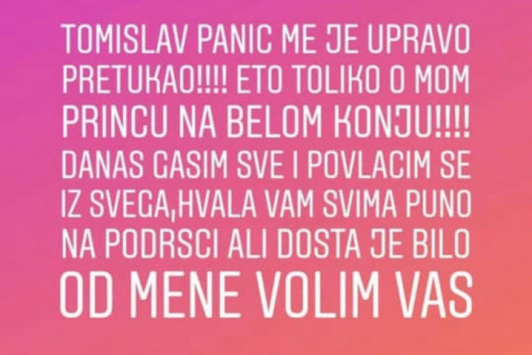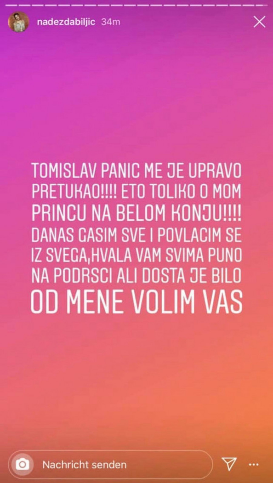 - Tomislav Panić me je upravo pretukao! Eto toliko o mom princu na belom konju. Danas gasim sve i povlačim se iz svega, hvala vam svima puno na podršci, ali dosta je bilo od mene. Volim vas! - napisala je Nadežda koja je potom objavila i fotografiju svog izudaranog lica.