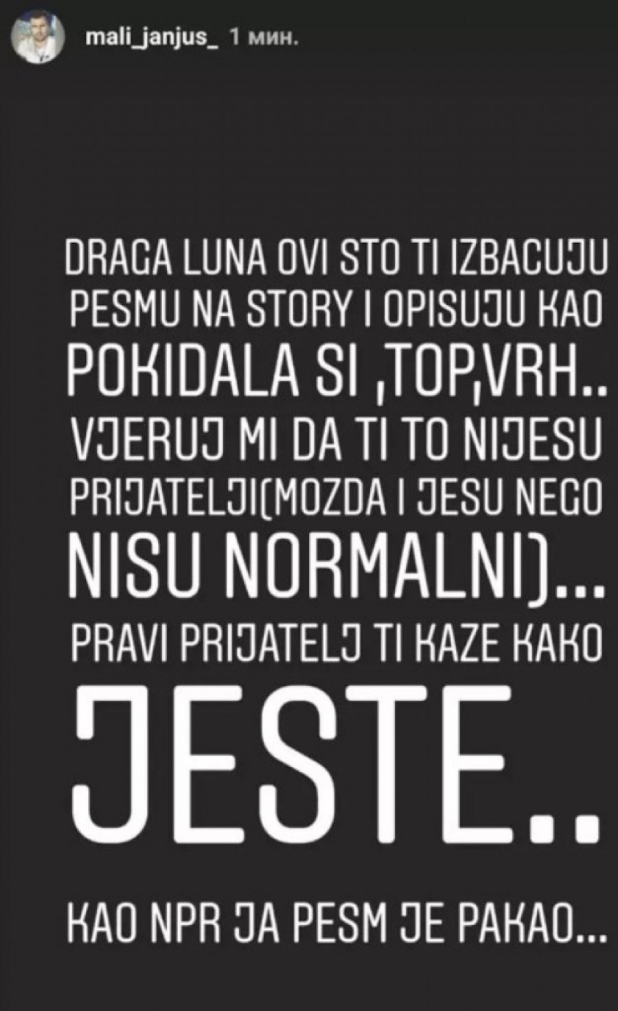 Foto: youtube.com/printscreen- Draga Luna, ovi što ti izbacuju pesmu na storiju i opisuju kao ,,Pokidala si. top, vrh", veruj mi da ti to nisu prijatelji! Možda i jesu, nego nisu normalni. Pravi prijatelj ti kaže kako jeste. Kao na primer ja, pesma je pakao... - bio je iskren Janjuš.