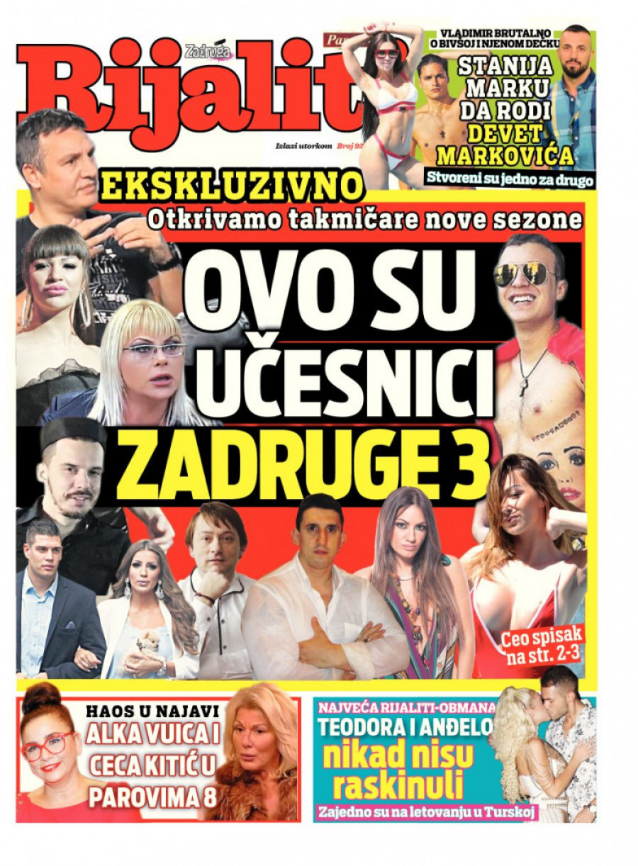 Foto: Promo fotoU ovom broju vam donosimo zanimljive priče o takmičarima nove sezone rijalitija "Zadruga 3", "Parovima 8", ali i starim učesnicima, koji ne prestaju da intrigiraju javnost: Teodori Džehverović, Vladimiru Tomoviću, Staniji Dobrojević, Marku Markoviću, Marijani Zonjić...