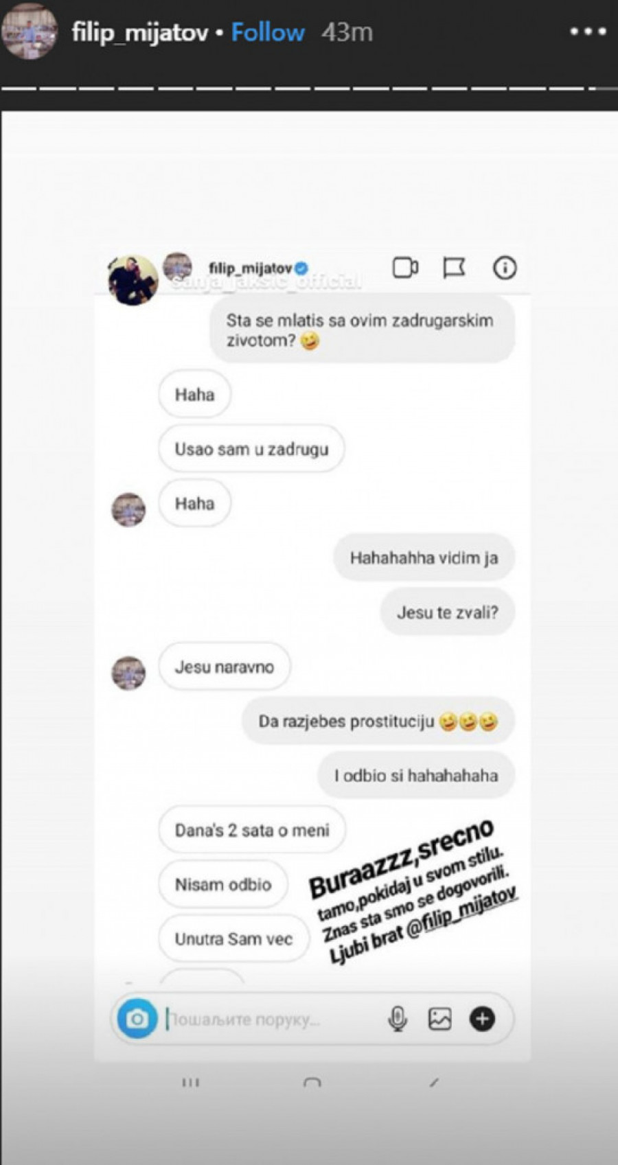 Foto: instagram.com/filip_mijatovIzolacija podrazumeva da učesnicima nije dozvoljeno korišćenje mobilnih telefona. Međutim, Filip Mijatov se zadrugarki iz prve sezone, Sanji Jakšić pohvalio da je već ušao u "Zadrugu" što znači da ipak kod sebe ima mobilni.