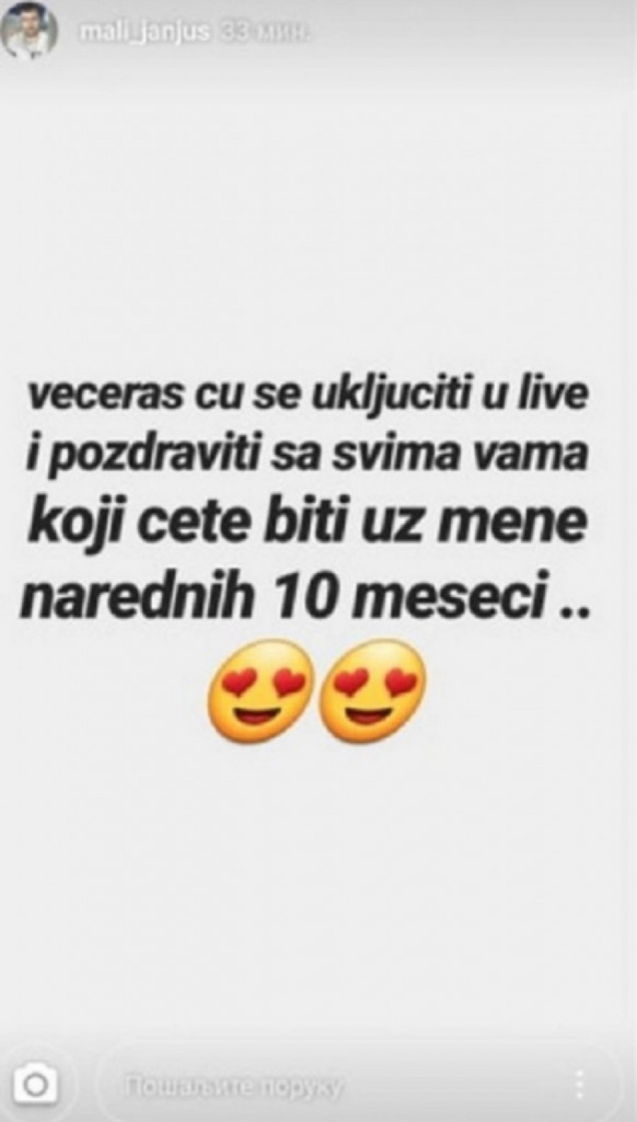 Foto: instagram.com/mali_janjusU svojoj priči one je objavio da će se večeras uključiti uživo, te tako pokrenuo glasine da je u karantin prošvercovao mobilni telefon.