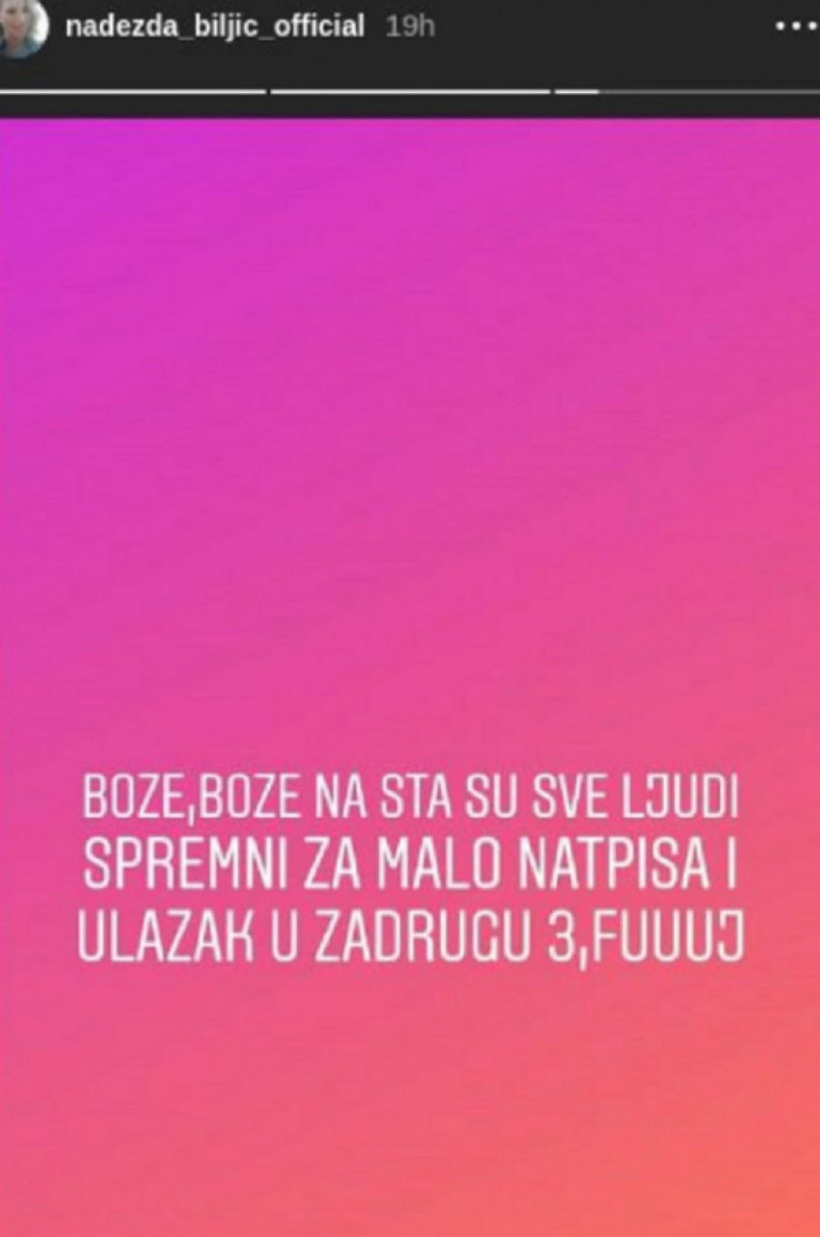 - Bože, bože na šta su sve ljudi spremni za malo natpisa i ulazak u Zadrugu 3, fuuj - napisala je Nadežda.