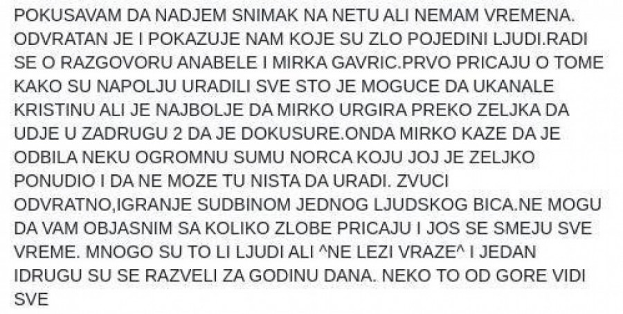 - Pokušavam da nađem snimak na netu, odvratan je i pokazuje koje su zlo pojedini ljudi, radi se o razgovoru Anabele i Mirka Gavirića. Prvo pričaju o tome kako su naplju uradili sve što je moguće da ukanale Kristinu, ali je najbolje da Mirko urgira preko Željka da uđe u "Zadrugu2" da je dokusure. Onda kažada je odbila neku obromnu sumu novca koju joj je Željko ponudio i da ne može tu ništa da uradi - pisalo je u komentaru.