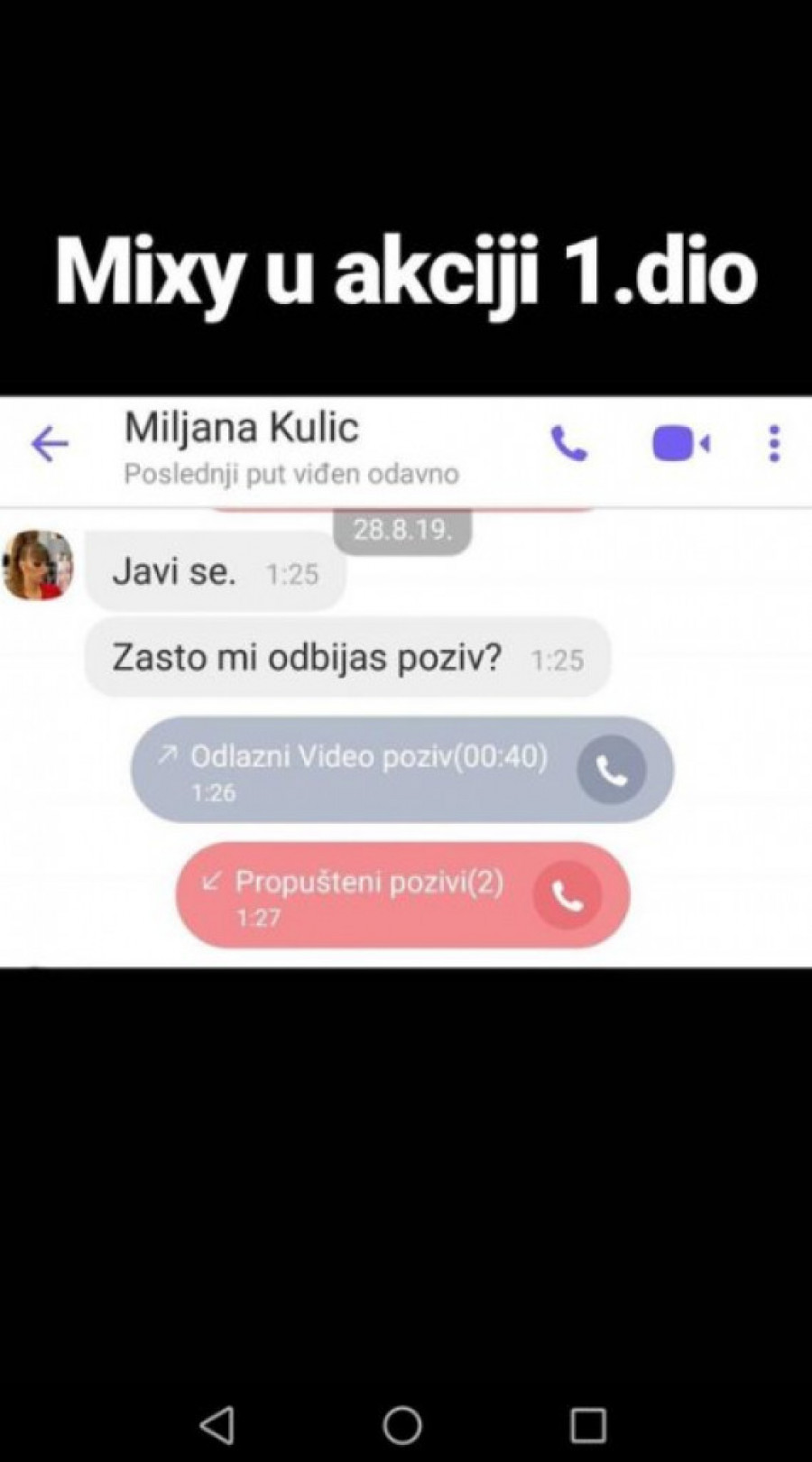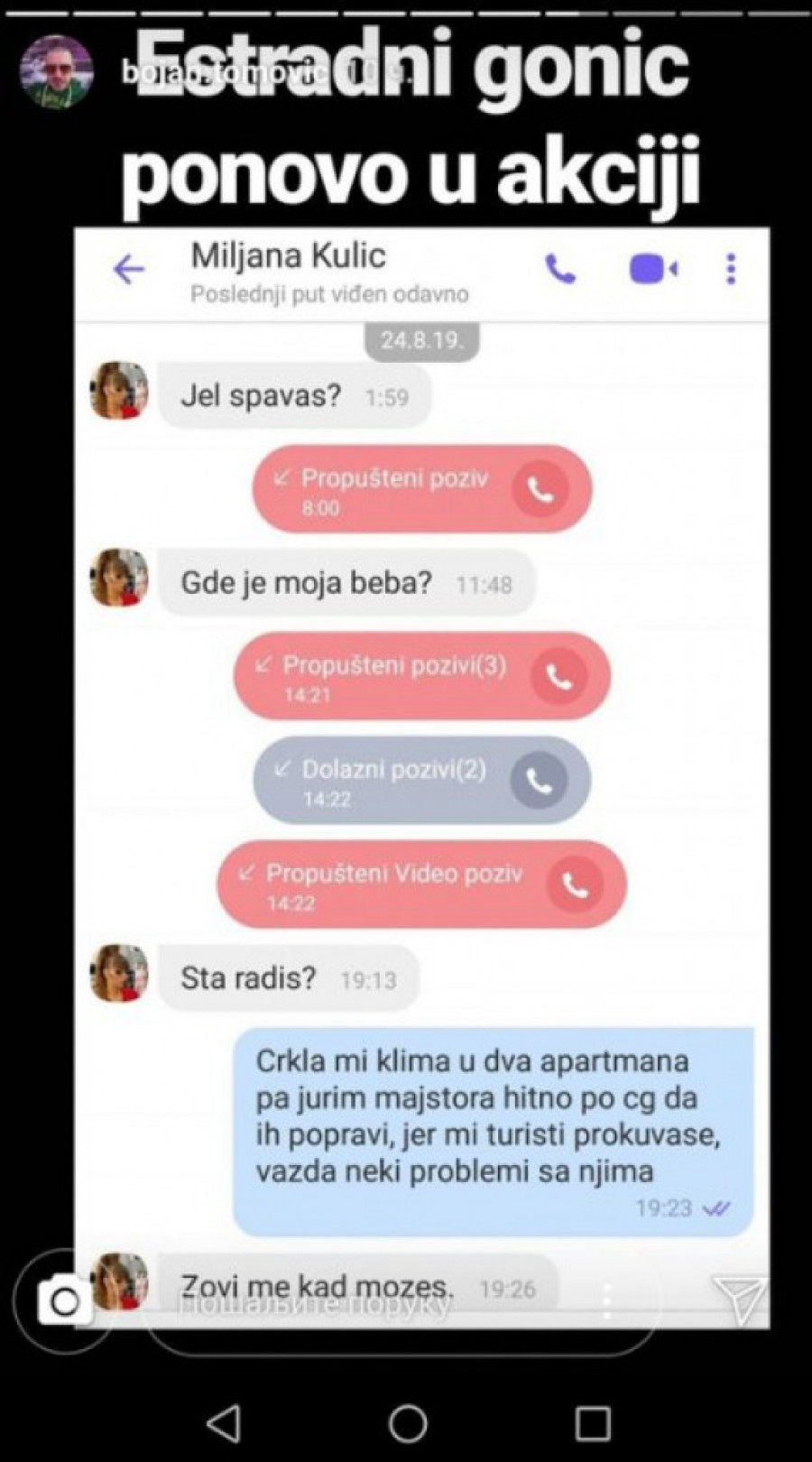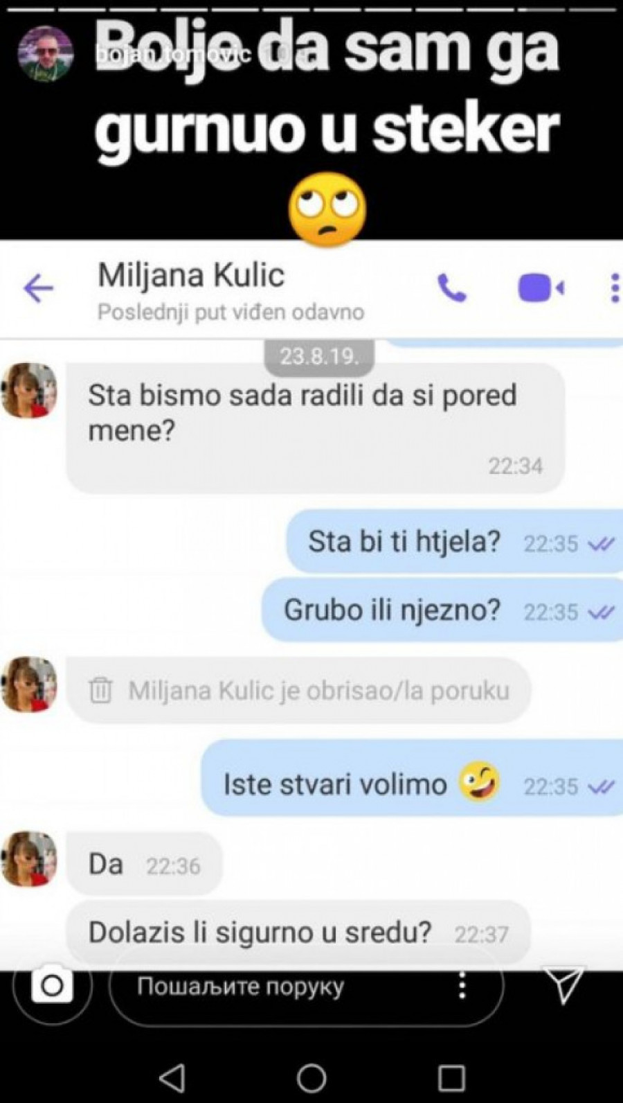Foto: instagram.com/miljanicakulicNaime, Bojan je objavio nekoliko skrinšotova njihove prepiske tvrdeći da ga je Miljana, nakon što ju je "otkačio", uhodila i uznemiravala sa njenog, pa čak i sa tuđih brojeva.