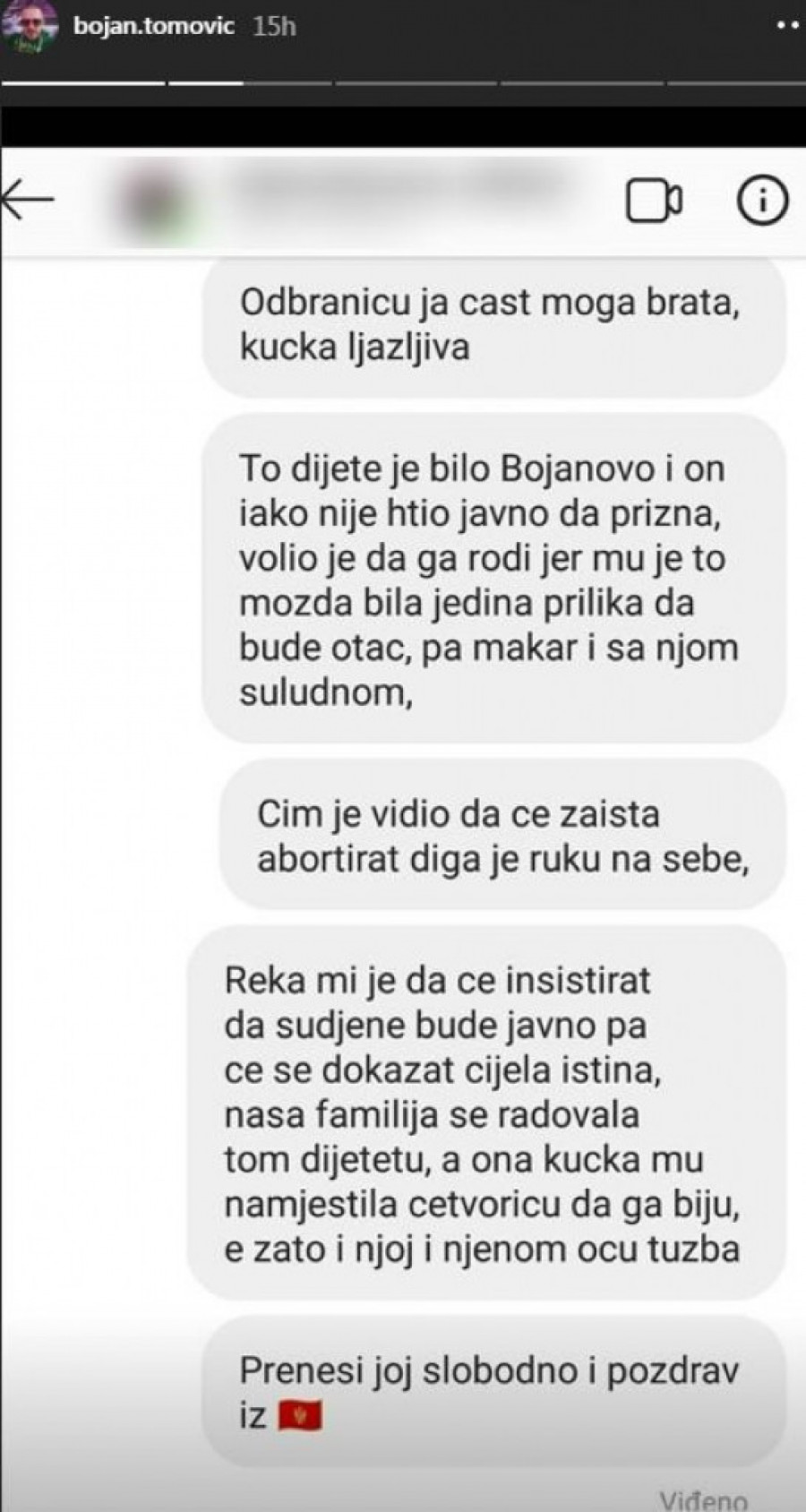 Tomovićeva sestra je kroz poruke rekla da će odbraniti čast svoga brata od Miljane Kulić.