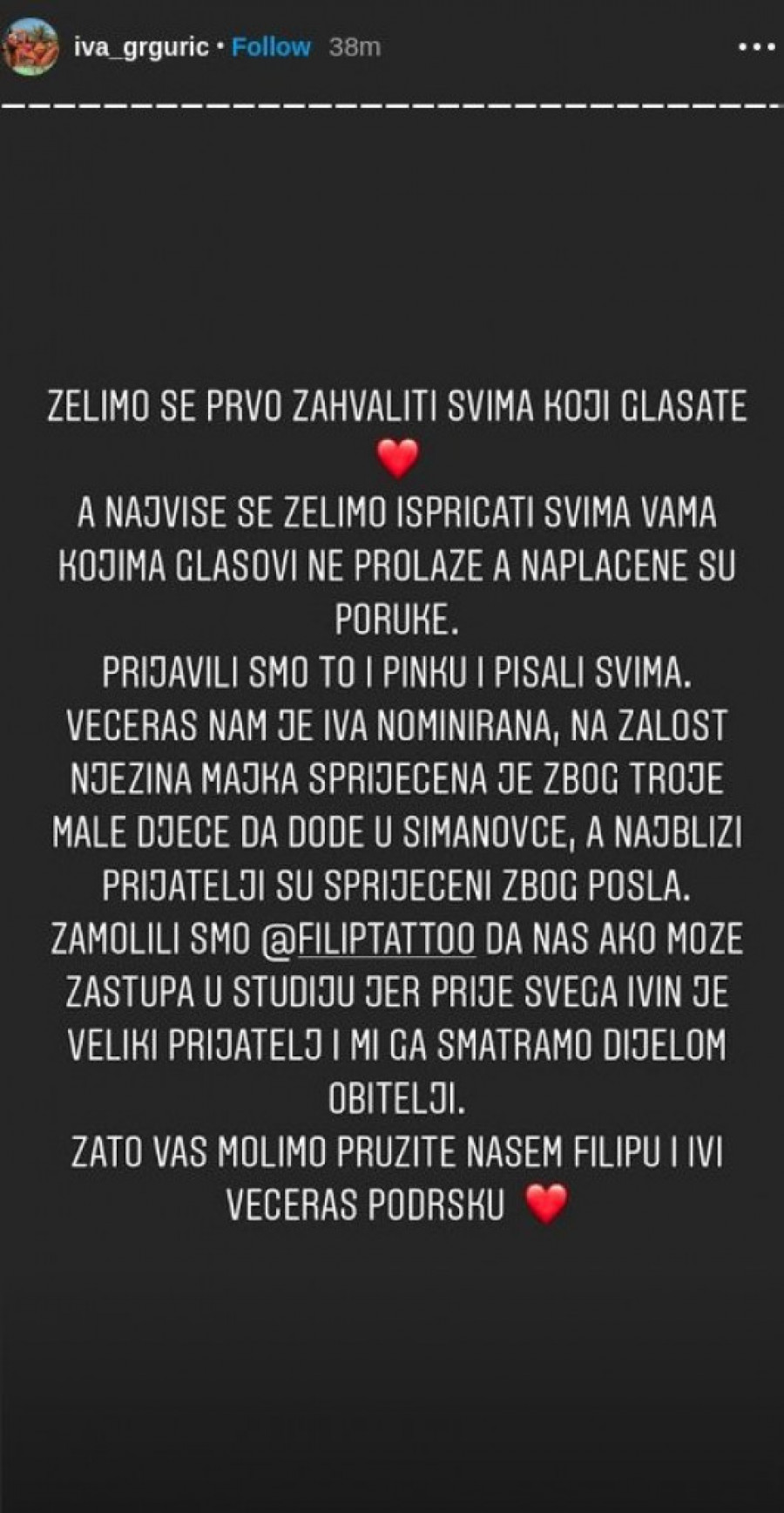 Foto: youtube.com/Zadruga Official- Večeras nam je Iva nominovana, na žalost, njena majka sprečena je zbog troje male dece da dođe u Šimanovce, a najbliži prijatelji su sprečeni zbog posla. Zamolili smo Filipa Reljića da nas ako može zastupa u studiju jer je pre svega Ivin veliki prijatelj, a i mi ga smatramo delom porodice. Zato vas molimo pružite našem Filipu i Ivi večeras podršku! - poručila je Ivina najbolja drugarica Barbara na Ivinom profilu na "Instagrama".