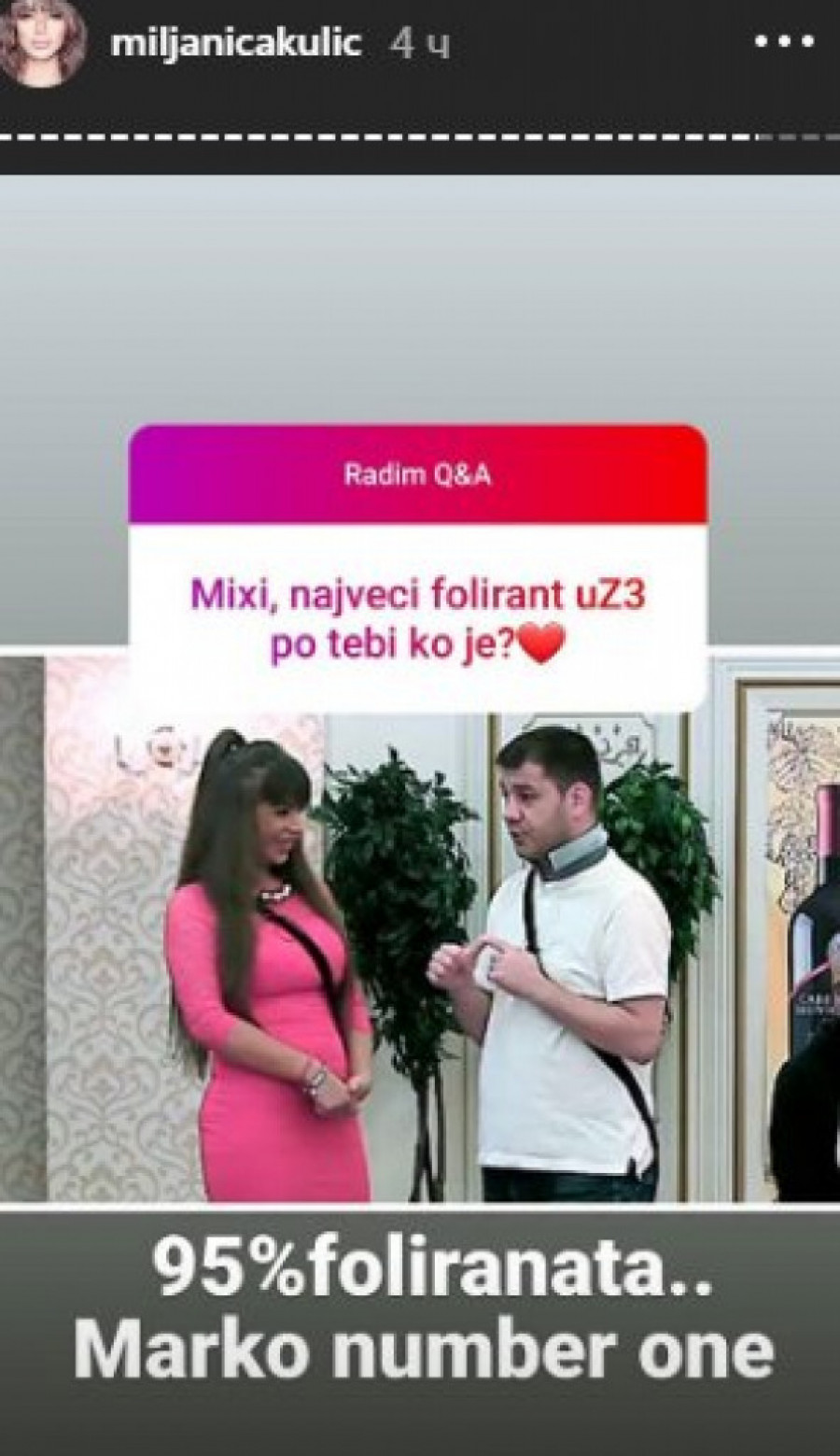 Foto: facebook.com/Miljana KulicKulićeva je odgovarala na pitanja svojih pratilaca, a jedno od njih je bilo da kaže ko je prema njenom mišljenju najveći folirant u "Zadruzi 3".