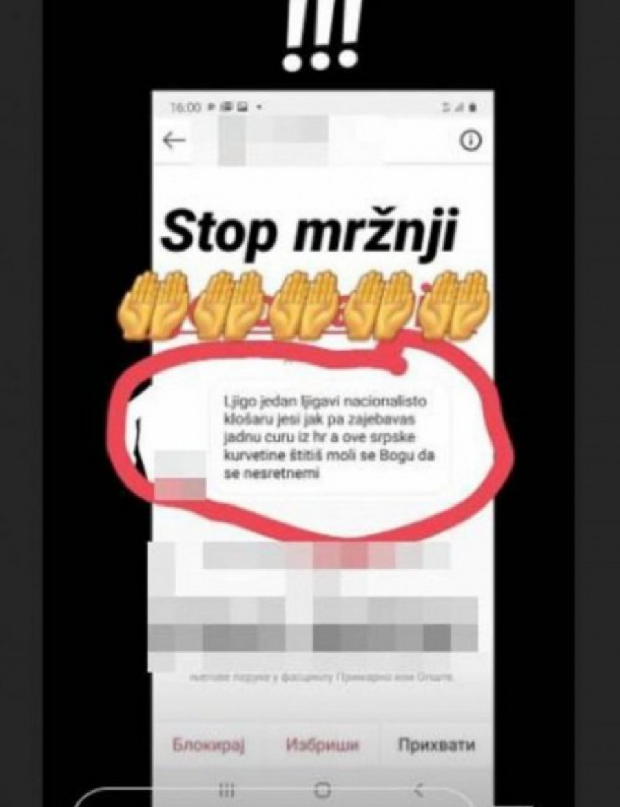 - Ljigo jedan ljigavi, nacionalisto, klošaru, jesi jak pa z*j*bavaš jadnu curu iz Hrvatske, a ove srpske k*rvetine štitiš. Moli se Bogu da se ne sretnemo - glasila je pretnja, koju je objavio Milan na svom Instagram storiju.