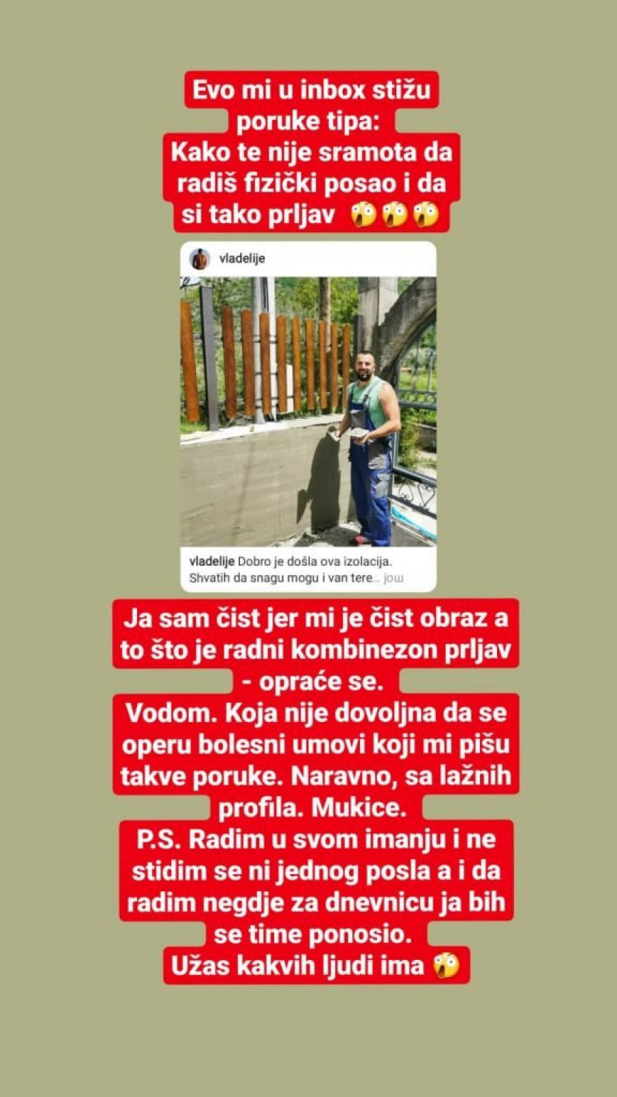 - Evo mi u inboks stižu poruke tipa: “Kako te nije sramota da radiš fizički posao i da si tako prijav?” Ja sam čist jer mi je čist obraz, a to što je radni kombinezon prljav – opraće se. Vodom. Koja nije dovoljna da se operu bolesni umovi koji mi pišu takve poruke. Naravno, sa lažnih profila. Mukice. P.S. Radim u svom imanju i ne stidim se ni jednog posla a i da radim negde za dnevnicu ja bih se time ponosio. Užas kakvih ljudi ima - napisao je Vladimir na Instagramu.