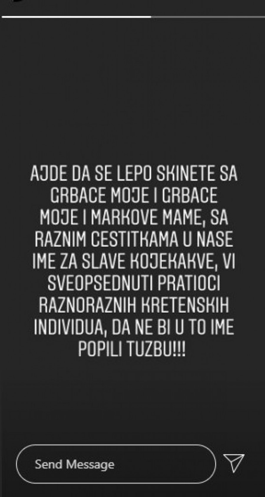 - Ajde da se lepo skinete sa grbače moje i grbačke moje i Markove mame, sa raznim čestitkama u naše ime za slave kojekakve, vi sveopsednuti pratioci raznoraznih kretenskih individua, da ne bi u to ime popili tužbu - poručila je Marija u Instagram storiju.