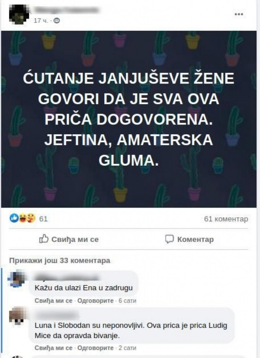 - Ćutanje Janjševe žene govori da je sva ova priča dogovorena. Jeftina, amaterska gluma - glasi jedan od brojnih statusa o Janjušu i Maji na Fejsbuk grupama na kojima se oglašavaju fanovi "Zadruge".