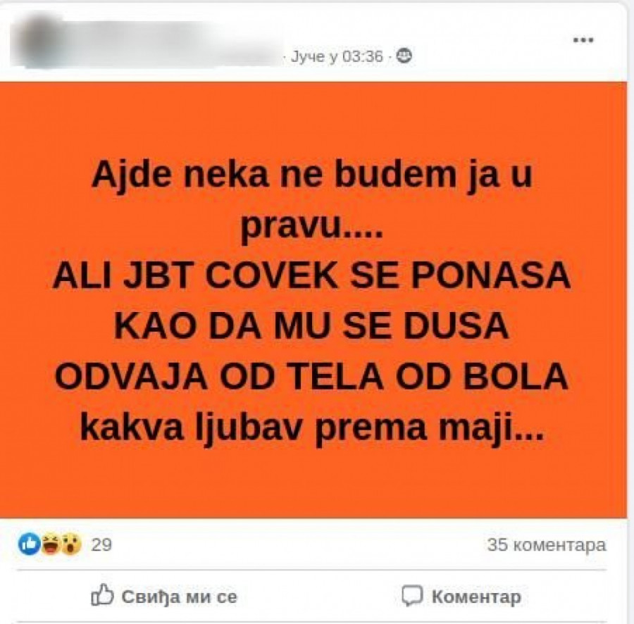 - Ajde, neka ne budem ja u pravu... Ali, čovek se ponaša kao da mu se duša odvaja od tela od bola... Kakva ljubav prema Maji - napisao je jedan komentator.
