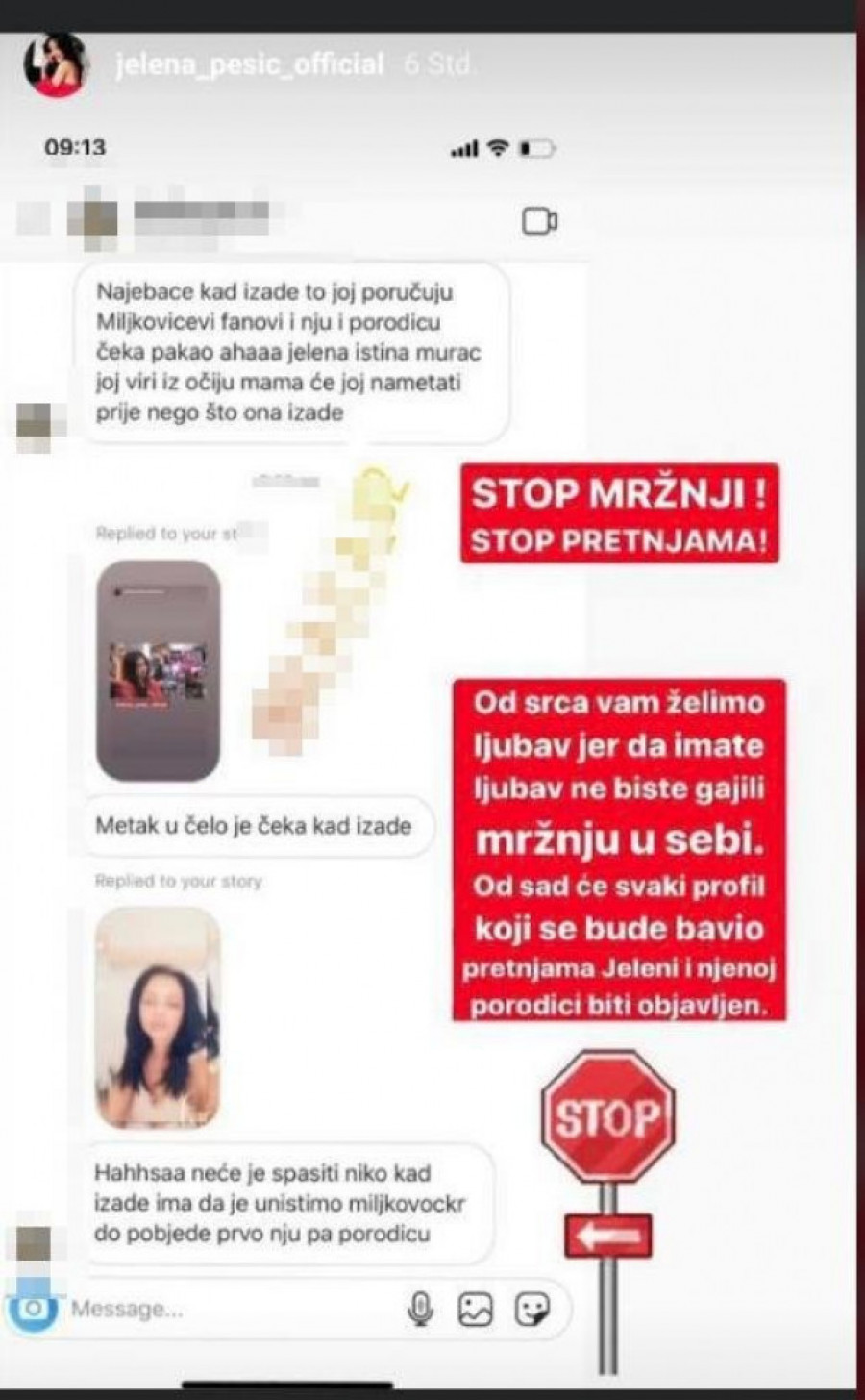 - Naj*baće kada izađe, to joj poručiju Miljkovićevi fanovi, i nju i porodicu čeka pakao. Metak u čelo je čeka kada izađe. Neće je spasiti niko kad izađe. Ima da je uništimo. Miljkovićke do pobede, prvo nju pa porodicu - pisalo je u porukama koje je objavila podrška Jelene Pešić na njenom zvaničnom Instagram profilu.