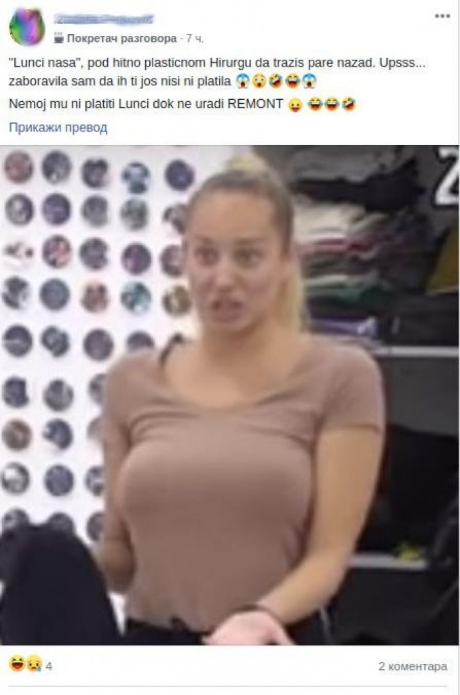 Foto: facebook.com/printscreen- "Lunči naša", pod hitno plastičnom hirurgu da tražiš pare nazad. Upsss... zaboravila sam da ih ti još nisi ni platila. Nemoj mu ni platiti, Lunči, dok ne uradi remont - napisala je gledateljka, uz fotografiju.