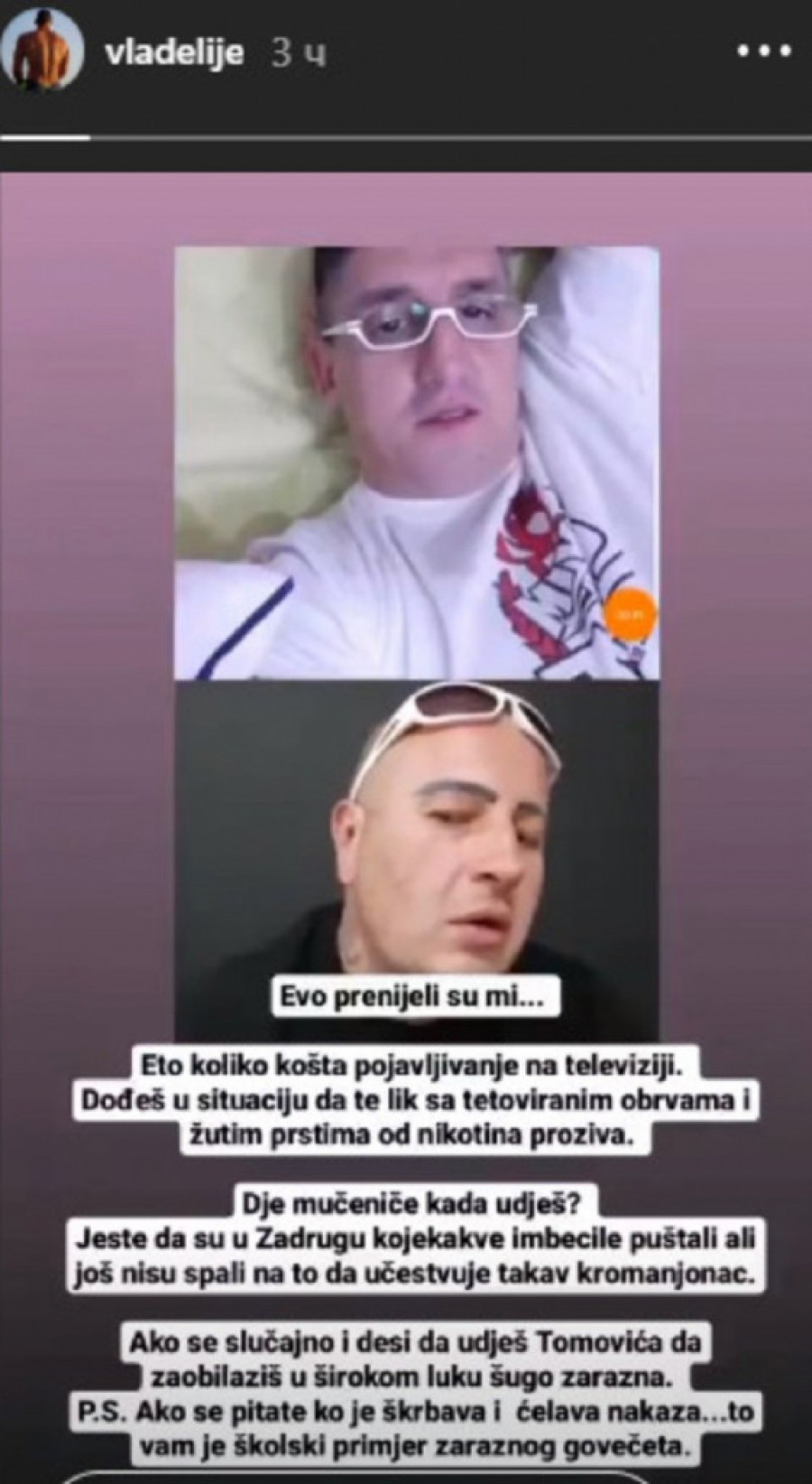 - Evo, preneli su mi... Eto koliko košta pojavljivanje na televiziji. Dođeš u situaciju da te lik sa tetoviranim obrvama i žutim prstima od nikotina proziva. Gde mučeniče kada uđeš?Jeste da su u Zadrugu puštali kojekakve imbecile, ali još nisu spali na to da učestvuje jedan kromanjonac. Ako se slučajno i desi da uđeš, Tomovića da zaobilaziš u širokom luku šugo zarazna. P.S. Ako se pitate ko je škrbava i ćelava nakaza... to vam je školski primer zaraznog govečeta - napisao je Vladimir kao odgovor na svom Instagram storiju.