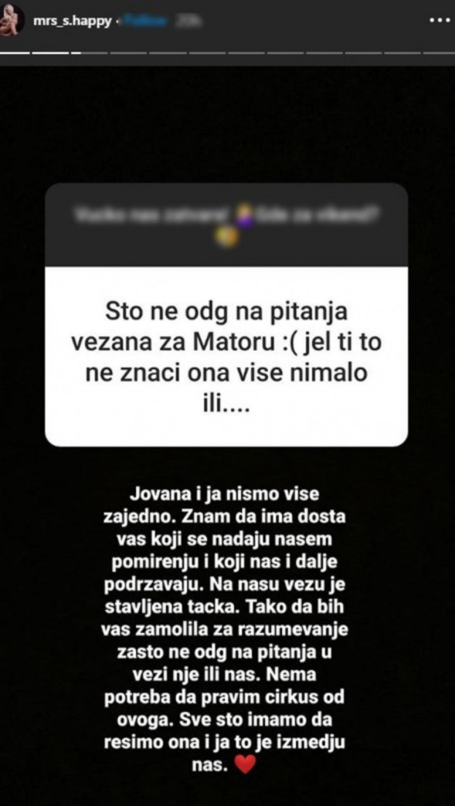 - Jovana i ja nismo više zajedno. Znam da ima dosta vas koji se nadaju našem pomirenju i koji nas i dalje podržavaju. Na našu vezu je stavljena tačka. Tako da bih vas zamolila na razumevanje zašto ne odgovaram na pitanje u vezi nje ili nas. Nema potrebe da pravim cirkus od ovoga. Sve što imamo da rešimo ona i ja, to je između nas - napisala je Sanja na Instagramu.
