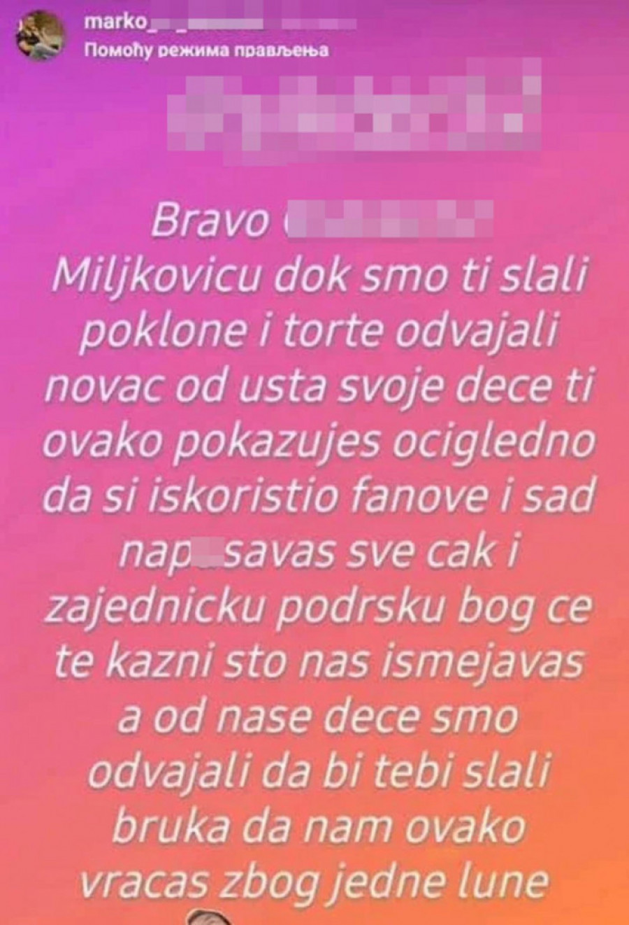- Bravo Miljkoviću, dok smo ti slali poklone i torte, odvajali novac od usta svoje dece, ti ovako pokazuješ. Očigledno da si iskoristio fanove i sad nap*šavaš sve, čak i zajedničku podršku. Bog će te kazniti što nas ismejavaš, a od naše dece smo odvajali da bi tebi slali. Bruka da nam ovako vraćaš zbog jedne Lune - napisali su fanovi Marka Miljković.