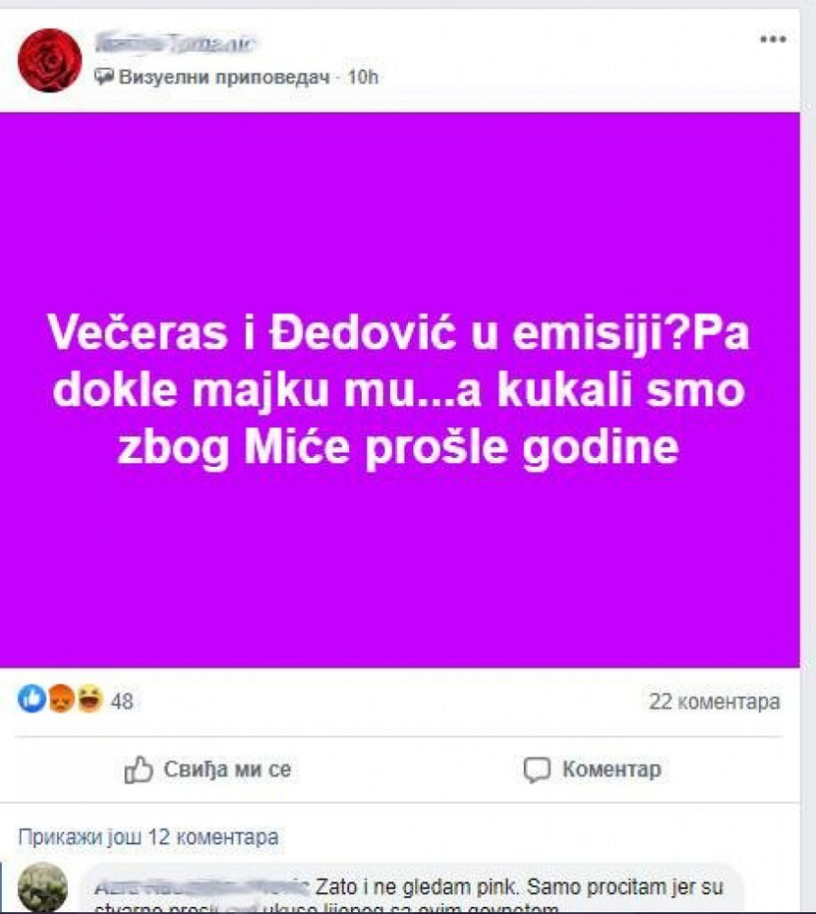 - Večeras i Đedović u emisiji? Pa, dokle, majku mu... a kukali smo zbog Miće prošle godine - istakao je jedan od članova Fejsbuk grupe.