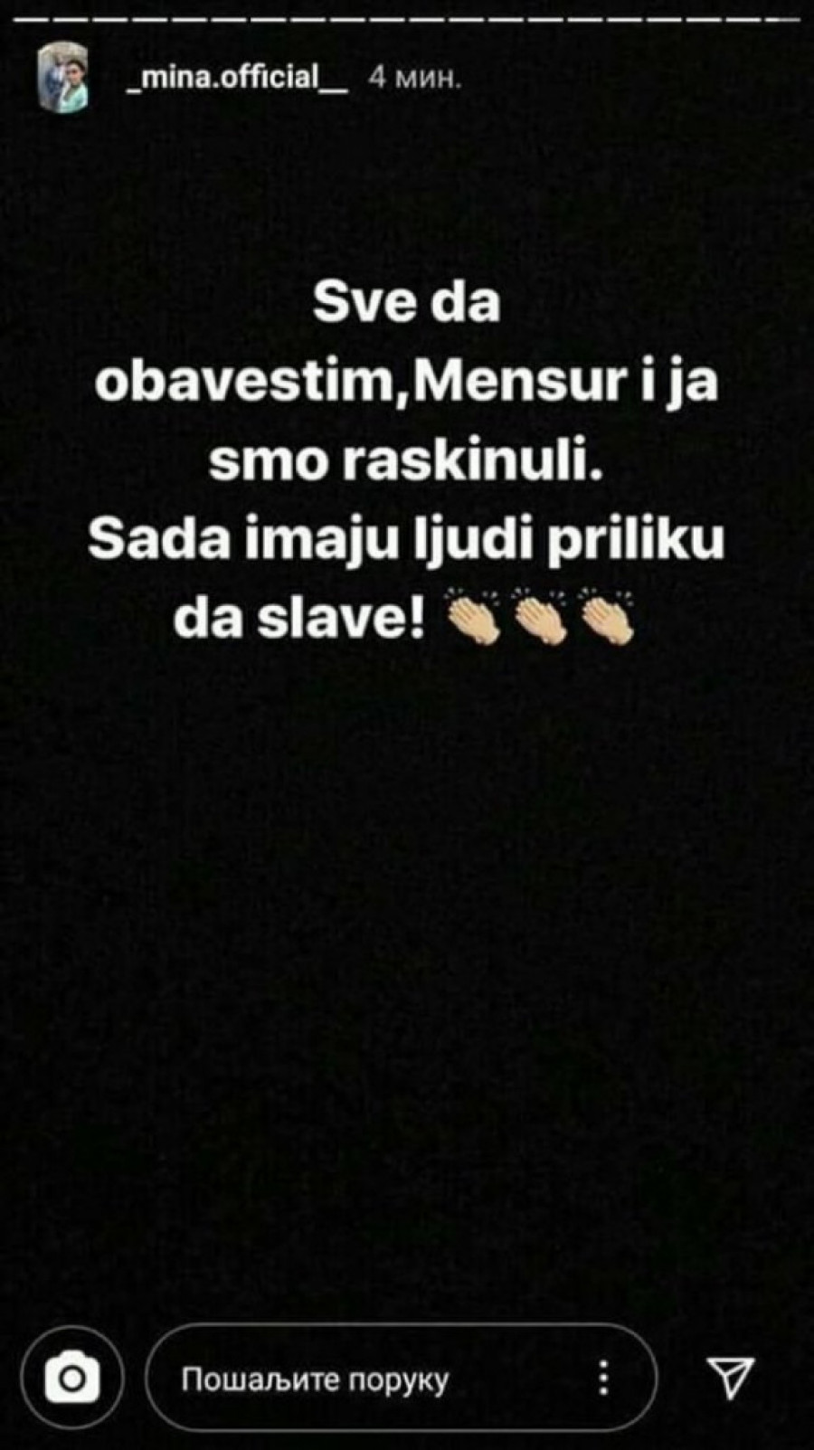 - Sve da obavestim, Mensur i ja smo raskinuli. Sada ljudi imaju priliku da slave - napisala je ona i stavila emotikon koji tapše.