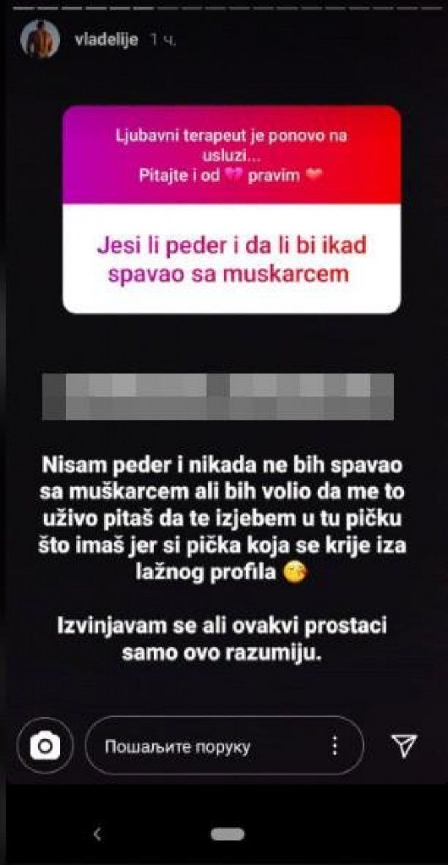 Foto: instagram.com/vladelije- Nisam p*der i nikada ne bih spavao sa muškarcem, ali bih voleo da me to uživo pitaš da te izj*bem u tu p*čku što imaš, jer si p*čka koja se krije iza lažnog profila. Izvinjavam se, ali ovakvi prostaci samo ovo razumiju - napisao je Vladimir.
